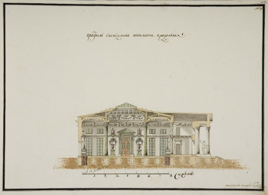 Чертеж. Продольный разрез Египетского павильона Останкинского дворца. Вид на север. Фиксационный чертеж. 1794-1795. Бизяев П.А.