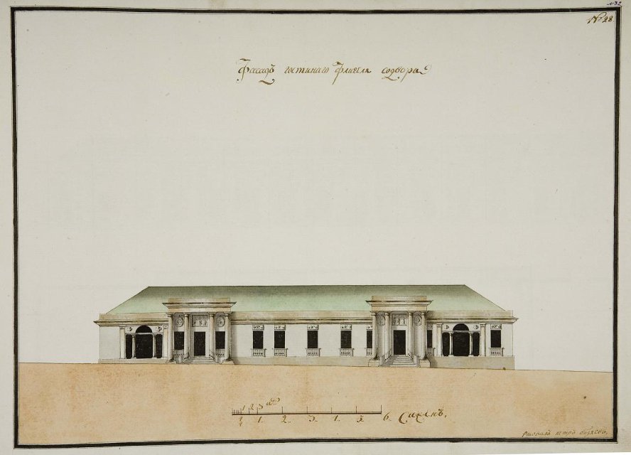 Чертеж. Фасад Гостиного флигеля со стороны парадного двора. Фиксационный чертеж. 1794-1795. Бизяев П.А.