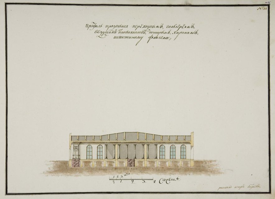 Чертеж. Продольный разрез проходной галереи от павильонов к Старым хоромам и к Гостиному флигелю Останкинского дворца. Фиксационный чертеж. 1794-1795. Бизяев П.А.