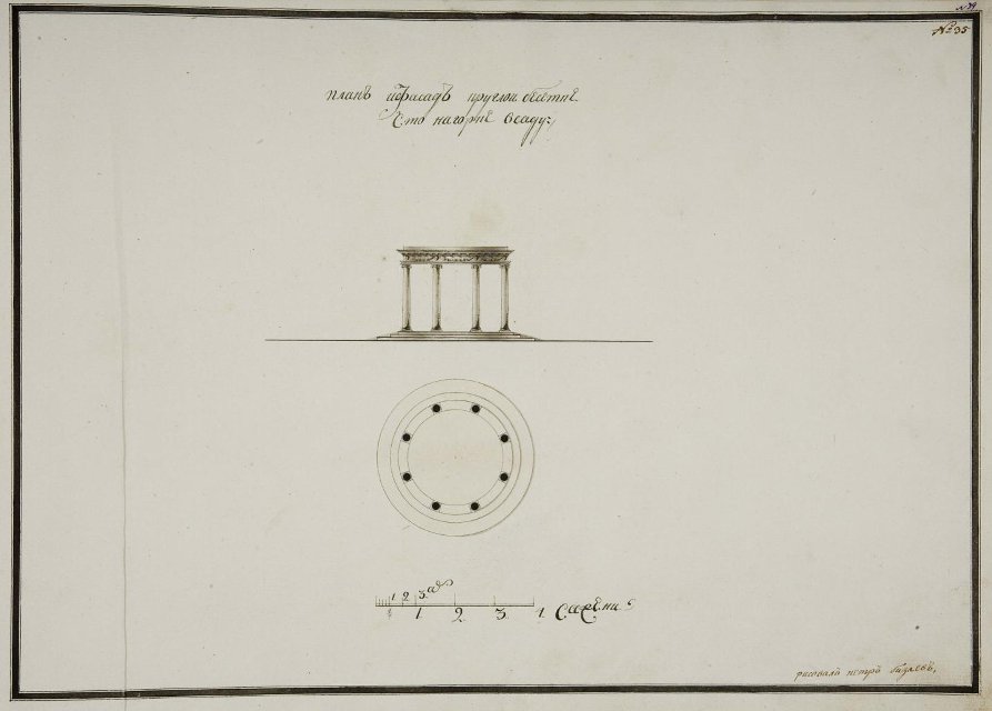 Чертеж. Внешний вид и план беседки на горке в Останкине. Фиксационный чертеж. 1795-1796. Бизяев П.А.