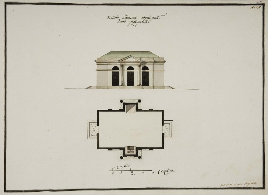 Чертеж. Фасад и план гардеробного флигеля в Останкине. Фиксационный чертеж. 1795. Бизяев П.А.