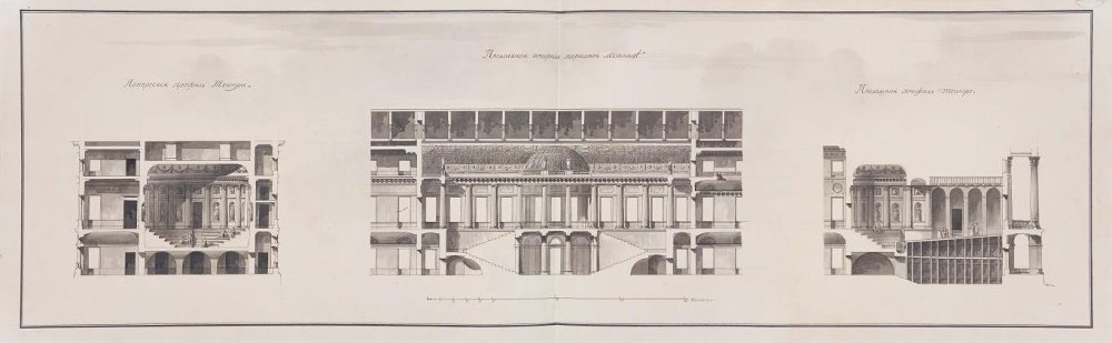 Чертеж. Проект "Большого и Красивого дома" Н.П.Шереметева на Никольской улице в Москве. Разрезы театра и парадной лестницы. Около 1792. Кваренги Дж.