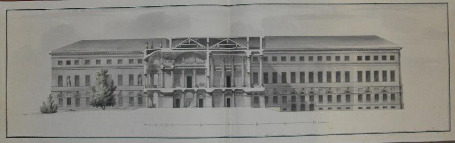 Чертеж. Проект "Большого и Красивого дома" Н.П.Шереметева на Никольской улице в Москве. Боковой фасад и разрезы ротонды и парадных залов. Около 1792. Кваренги Дж.