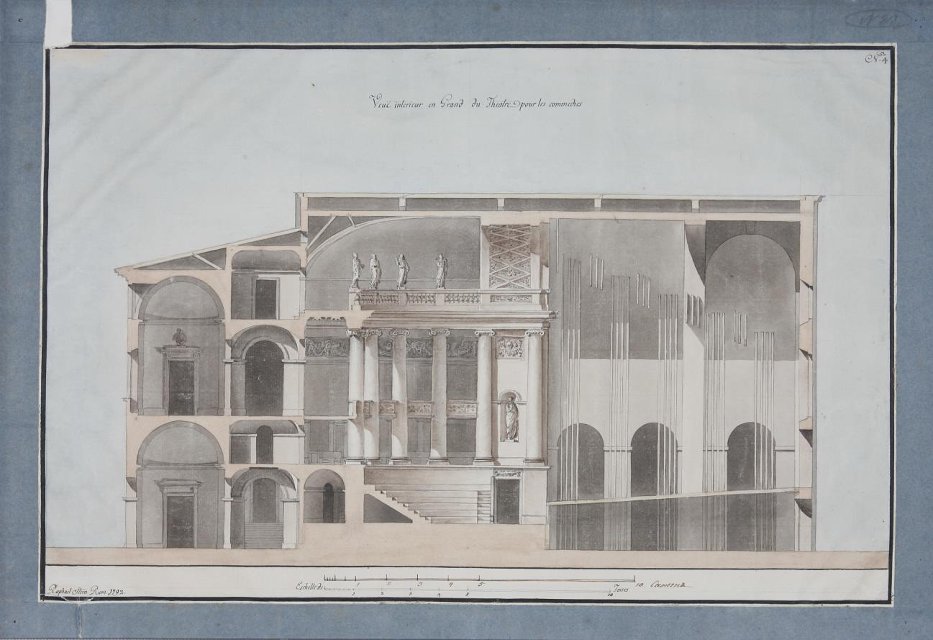 Чертеж. Проект "Большого и Красивого дома" Н.П.Шереметева на Никольской улице в Москве. Продольный разрез театра. 1792. Стерн Р.