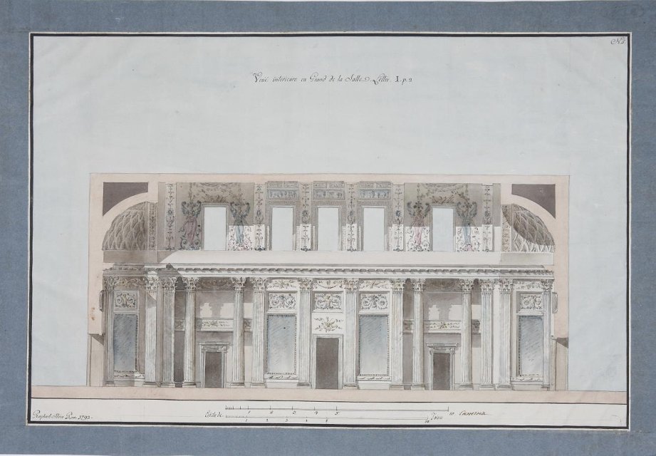 Чертеж. Проект "Большого и Красивого дома" Н.П.Шереметева на Никольской улице в Москве. Продольный разрез парадного зала. 1792. Стерн Р.