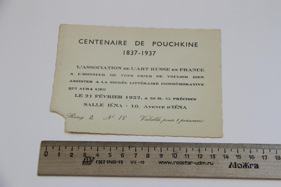 Документ. Пригласительный билет на одного человека на литературный вечер, посвященный столетию со дня смерти А.С. Пушкина: «Сentenaire de Pouchkine 1827-1937», который состоялся в Париже в зале Iena 21 февраля 1937 г. Франция, 1937.