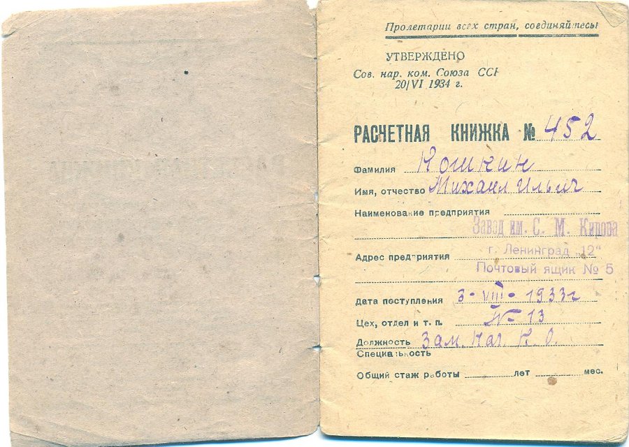 Книжка расчётная № 452 Кошкина М.И. Завод им.С.М.Кирова. 1933г