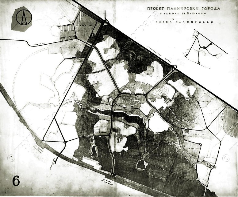 Фотография ч/б. План "Проект планировки города в районе станции Крюково. Схема планировки". Вариант №6. 1958