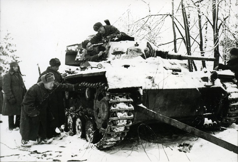 Фотография ч/б. Западный фронт. Разгром немцев под Москвой. Первые трофеи. Бойцы 8 Гвардейской им. И.В.Панфилова стрелковой дивизии осматривают подбитый немецкий танк в д.Крюково. 8 декабря 1941 г. 1975. Кинеловский В.С.