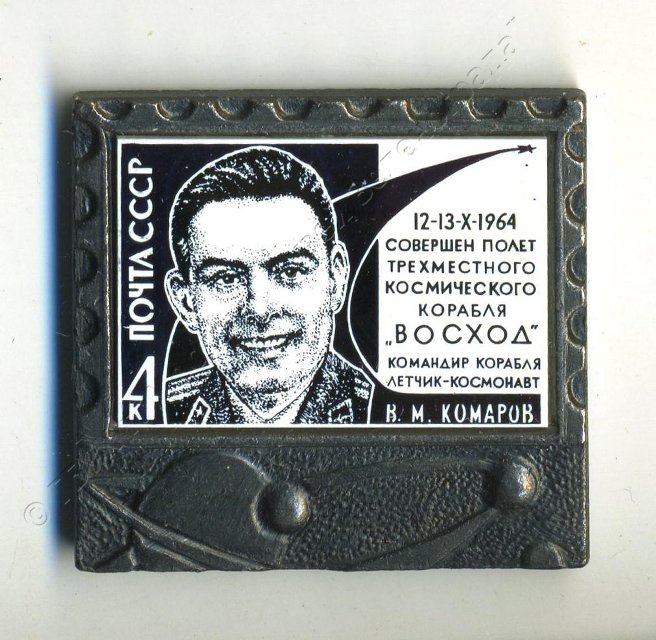 Значок "12-13.Х.1964 совершен полет трехместного космического корабля "ВОСХОД". Командир корабля летчик-космонавт В.М. Комаров". 1980-1982
