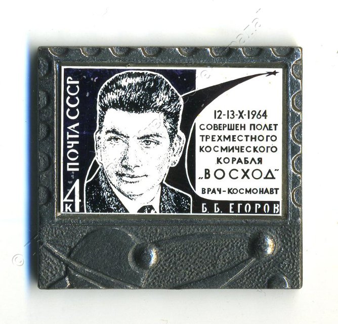 Значок "12-13.Х.1964 совершен полет трехместного космического корабля "ВОСХОД". Врач-космонавт Б.Б. Егоров". 1980-1982