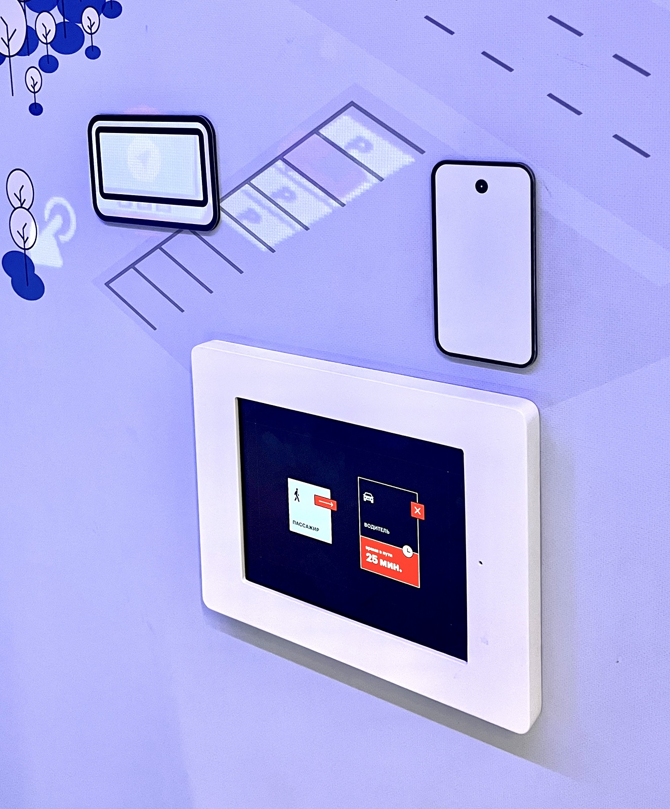 Выберите на планшете, расположенном на стене, сценарий «Водитель». Прикройте ладонью навигатор, высветившийся на стене чуть выше, слева от планшета. Видите? Импульс ушёл прямиком в ЦОДД. Там, исходя из сложившейся дорожно-транспортной ситуации, происходит точный расчёт маршрута. Как только маршрут будет построен, информация появится у вас в навигаторе. Смотрим: время в пути составит 25 минут. Закройте ладонью сообщение «начать движение».