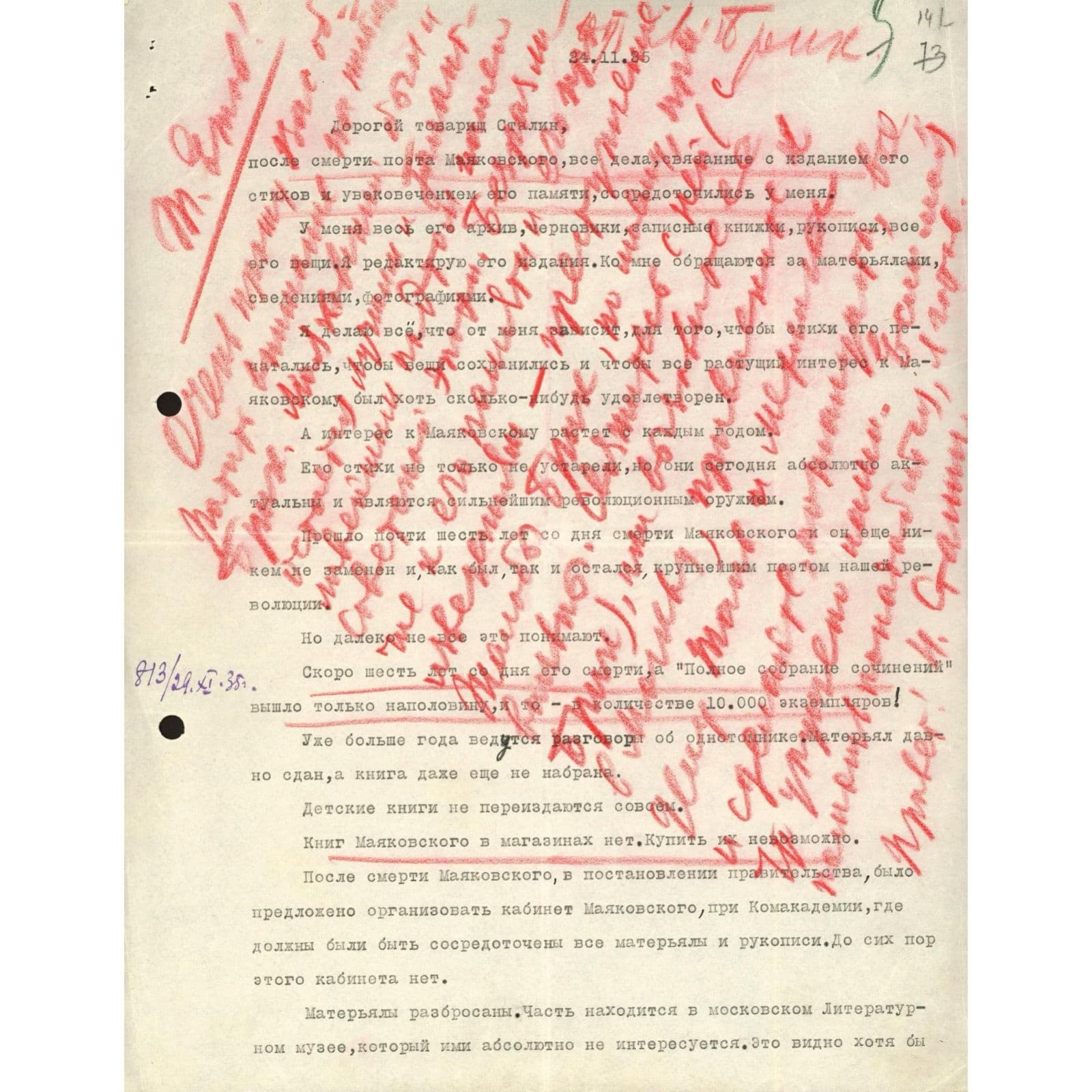 Жизнь Владимира Маяковского оборвалась в 1930 году, и его слава, которая до этого была неоспорима, стала постепенно меркнуть, количество публикаций о нем и тиражи уменьшились, произведения исключались из школьной программы, музея не было, стихи со сцены почти не звучали. Чтобы вернуть поэту заслуженное место в истории, в конце 1935 года Лиля Брик написала Иосифу Сталину письмо с жалобой на бездействие и бюрократическое отношение чиновников от Госиздата, Наркомпроса и других руководящих инстанций к литературному наследию Маяковского и к его памяти. Именно на этом письме Сталин написал резолюцию, которая стала знаменитой и знаковой: «Тов. Ежов! Очень прошу вас обратить внимание на письмо Брик. Маяковский был и остается лучшим и талантливейшим поэтом нашей Советской эпохи. Безразличие к его памяти и его произведениям – преступление. Жалоба Брик, по-моему, правильна. Свяжитесь с ней (с Брик) или вызовите ее в Москву… Если моя помощь понадобится – я готов. И. Сталин». Резолюцию опубликовали в газете «Правда» 5 декабря 1935 года в редакционной подборке материала о Маяковском. Там же было размещено сообщение, что «Московский совет постановил создать в доме, где жил Маяковский (Гендриков переулок, дом 13/15), Библиотеку-музей, а также переименовать Гендриков переулок в переулок Маяковского». Поэта стали печатать массовыми тиражами, но за исключением академических изданий выбор был весьма тенденциозным: главное внимание уделялось политически корректным произведениям, тогда как стихи футуристического периода практически не издавались.