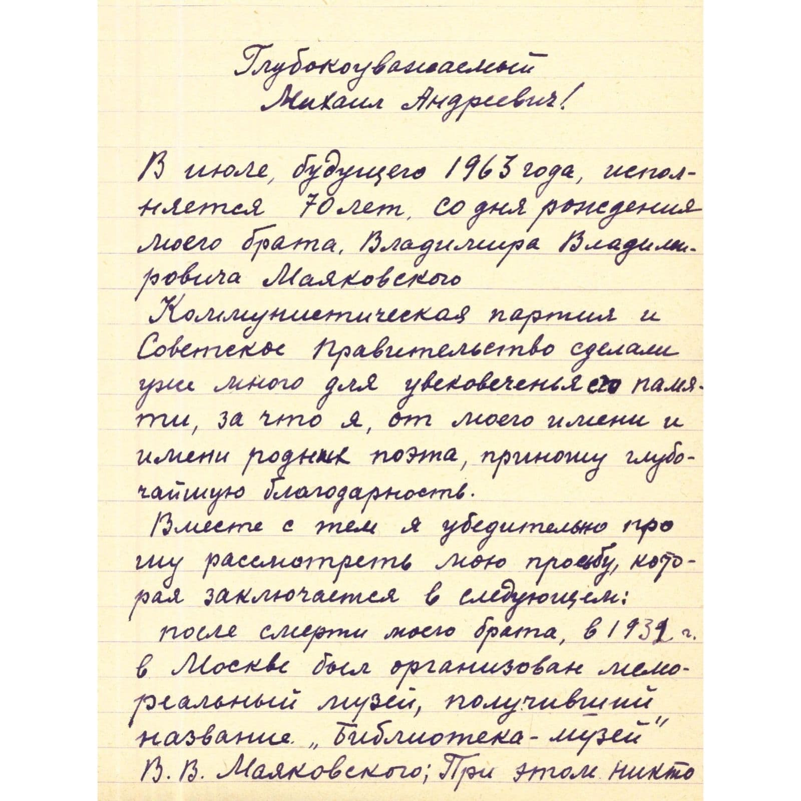 Людмила Маяковская, старшая сестра поэта, после его смерти в 1930 году посвятила себя пропаганде его творчества. Взгляды Людмилы на наследие брата сильно расходились со взглядами его главной музы – Лили Брик. Людмила, мягко говоря, не любила Лилю, старалась вымарать ее имя из биографии Маяковского, и неплохо тогда в этом преуспела. В частности, летом 1962 года она написала письмо члену Президиума ЦК КПСС, главному идеологу страны Михаилу Суслову с просьбой закрыть Библиотеку-музей В.В. Маяковского в переулке Маяковского (Гендриков переулок) и открыть музей поэта в проезде Серова (Лубянский проезд). Все дело в том, что четырехкомнатную квартиру в Гендриковом переулке Маяковский занимал вместе с Лилей и Осипом Бриками. Музей в этом помещении был открыт в 1938 году по инициативе Лили, которая обращалась за помощью к Иосифу Сталину. В своем же письме Людмила Маяковская сообщила, что, создавая музей в Гендриковом, никто не посоветовался с семьей поэта. Вместо того, чтобы пропагандировать там его творчество, приходится объяснять назначение комнат и говорить о тройственном союзе Маяковского и Бриков. «У молодежи это вызывает недоумение, у многих складывается неправильное представление, тогда как эта сложная, тяжелая для моего брата жизнь создалась по вкусу Лили Юрьевны и Осипа Максимовича». Были и другие письма на эту тему от сестры поэта в высшие инстанции. Ей удалось добиться своего – музей был переведен в Лубянский проезд.