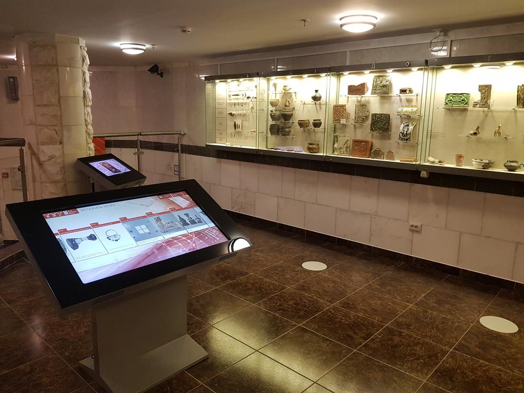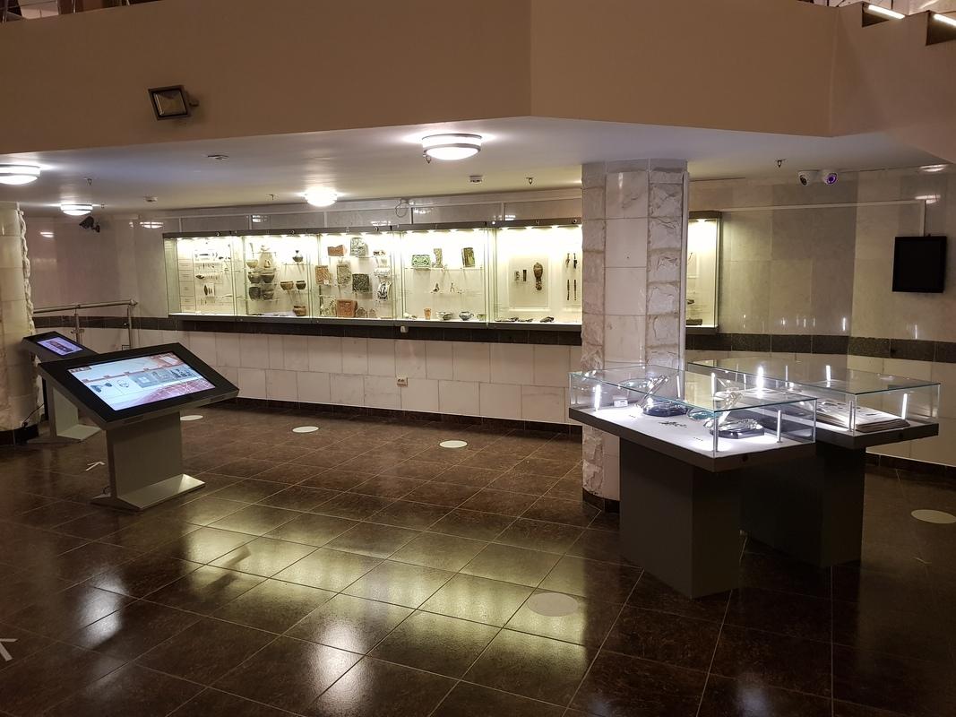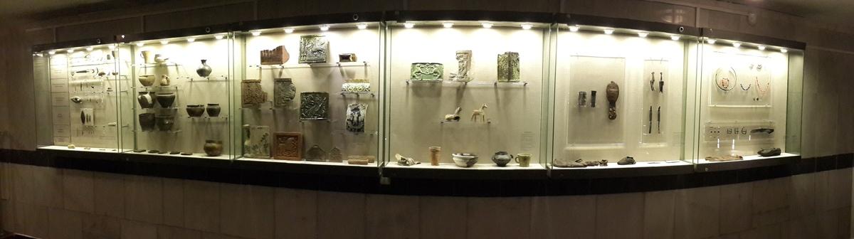 Спустившись по лестнице на нижний ярус Вы увидите несколько настенных витрин. В этом разделе представлена своего рода лаборатория археолога. Работа ученого заключается не только в проведении раскопок, но и последующем исследовании найденных вещей. Первые три витрины знакомят с археологической хронологией на примере находок Московского региона. В основе археологической периодизации лежит материал, из которого изготавливались главные орудия труда. Так выделяют каменный, бронзовый и железный века. В первой витрине представлена единая хронологическая шкала, показанная в виде условного среза культурного слоя, от древнего каменного века до нового времени и предметы, характерные для этих эпох. В соседней витрине показана эволюция глиняной посуды. Так, первые сосуды эпохи неолита имели большие размеры, они были предназначены для хранения, переноски продуктов и приготовления из них пищи. Внешняя поверхность этих сосудов сплошь покрывалась ямочно-гребенчатым орнаментом. В эпоху бронзы происходит заметное уменьшение объема посуды, появляются сосуды разных форм. Ближе к современной посуда становится в раннем железном веке, в 1-ом тысячелетии до нашей эры. При изготовлении посуды часто использовали ткань, от чего на их поверхности оставались отпечатки «сетки». Около 3 века нашей эры появляются сосуды с тщательно отполированной до блеска поверхностью. До эпохи средневековья вся глиняная посуда была лепная. Настоящий переворот в ее изготовлении связан с началом использования гончарного круга. В витрине представлены классические раннесредневековые горшки из курганных захоронений 12 – 13 веков и изделия гончаров 14 – 17 столетий. Рост Москвы в позднее средневековье обуславливал увеличение спроса на различную качественную глиняную посуду. Появились разнообразные виды чернолощеной, поливной и расписной керамики. В 18 – 19 веках, эпоху нового времени, несмотря на широкое распространение металлической, фаянсовой и майоликовой посуды, продолжала бытовать и простая глиняная, которая дожила до наших дней в виде обычного цветочного горшка на подоконнике. Еще в одной витрине представлена научная классификация изразцов – глиняных изделий, которыми украшали печь.