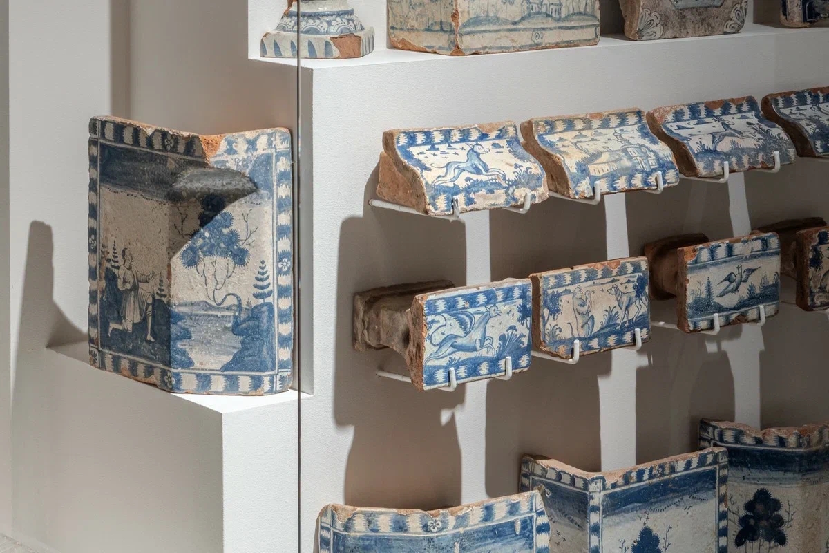 В правление Елизаветы Москва стала крупнейшим центром текстильного производства. Здесь также чеканили монету, изготавливали бумагу, кирпич, кожаные изделия, предметы из стекла. Керамические заводы выпускали посуду, черепицу, «табашные» трубки и изразцы — на них спрос был особенно велик. Облицованные изразцами печи неизменно украшали интерьеры московских домов XVIII века: дворцов, городских усадеб и более скромных построек. Такого рода изразцы вы можете видеть в витрине. В отличие от XVII века эти изразцы гладкие и расписные. Сначала сине-белые плитки доставлялись Голландии и Германии, а затем стали производиться и в России.