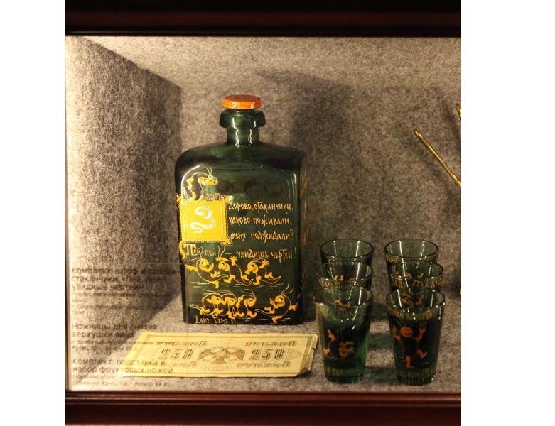 Комплект из штофа и стопок «Пей-пей — увидишь чертей!» изготовлен на Императорском стекольном заводе в 1897 году.