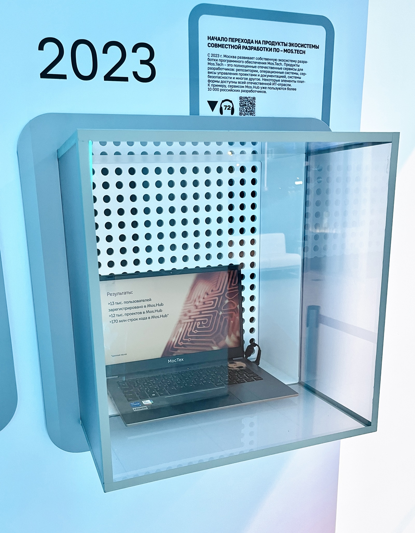 Вы видите уникальный продукт – ноутбук Мос.тех. Изучите информацию на экране и узнайте больше о возможностях и перспективах развития экосистемы Mos.Tech.