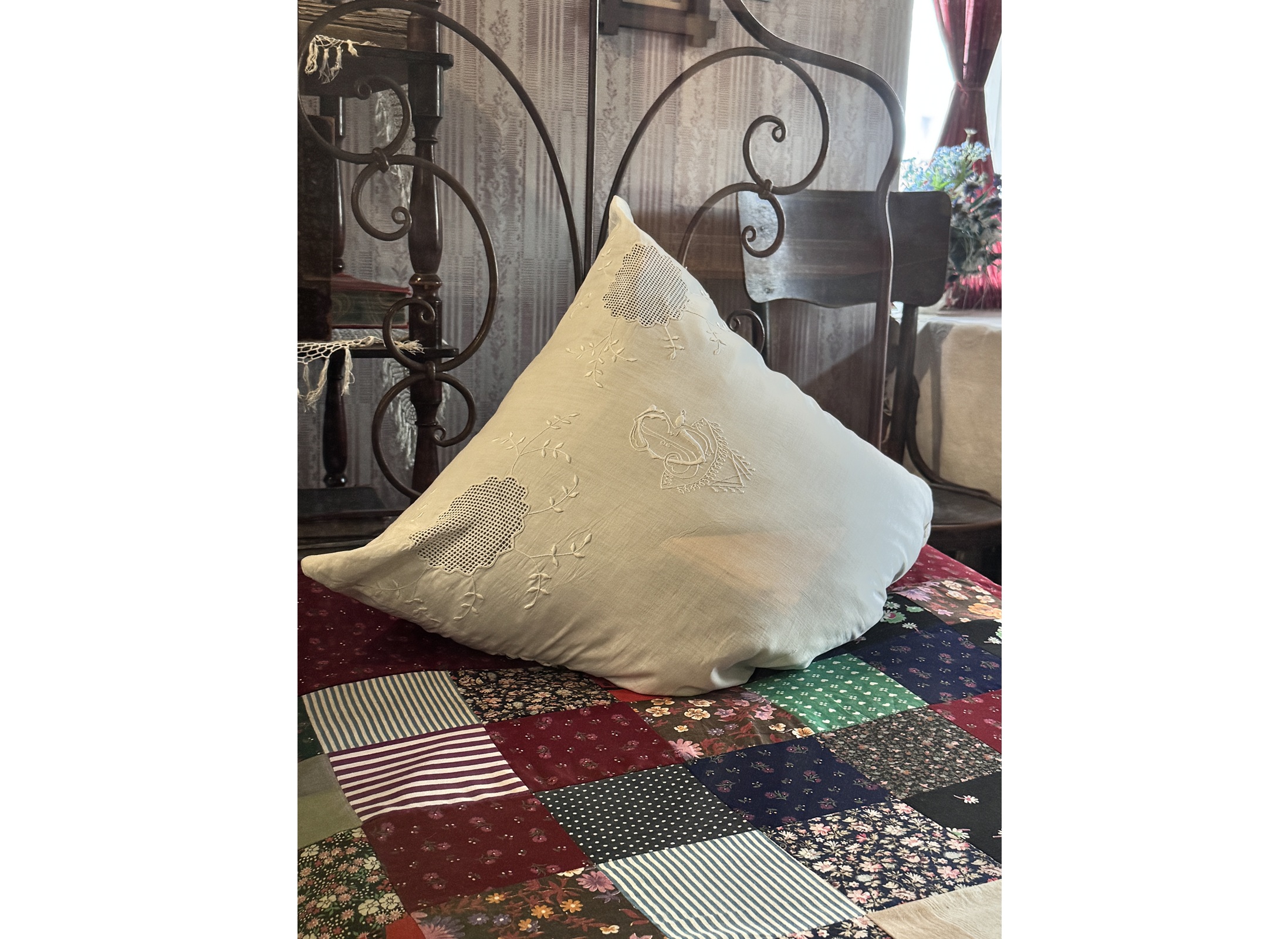 Наволочку лежащей на кровати подушки-думочки украшала вышивкой мать поэта, Татьяна Федоровна Есенина, в девичестве Титова, умелая рукодельница. Младшая сестра Сергея Есенина, Александра, вспоминала о ней: «Наша мать была единственной девочкой в доме Титовых и поэтому была любимицей. Она была стройна, красива, лучшая песенница на селе, играла на гармони, умела организовать веселую игру.