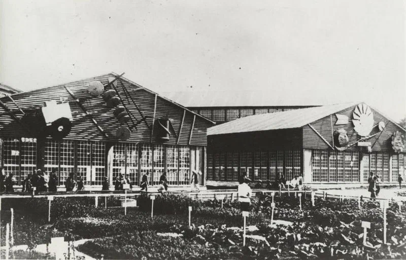 Одно из ярчайших городских событий времен НЭПа — открытие в 1923 году Всесоюзной сельскохозяйственной и кустарно-промышленной выставки. Ее устроили на территории бывших свалок у Крымского моста, на месте нынешнего Парка Горького. Она наследовала традиции дореволюционных Всероссийских промышленных выставок. Планировкой выставки занимался Иван Жолтовский, а главным архитектором был Алексей Щусев. Всего было возведено 255 выставочных павильонов. Они были посвящены промышленной и кустарной продукции различных регионов СССР, новому быту и техническим достижениям. Часть павильонов представлена на фотографиях в витрине. Отчасти выставка была и колониальной, этнографической; демонстрировались привезенные в Москву ненецкие чумы, якутские юрты, кавказские сакли. Свои павильоны имели также иностранные представительства. Выставка пользовалась невероятной популярностью — ее посетили почти полтора миллиона человек.