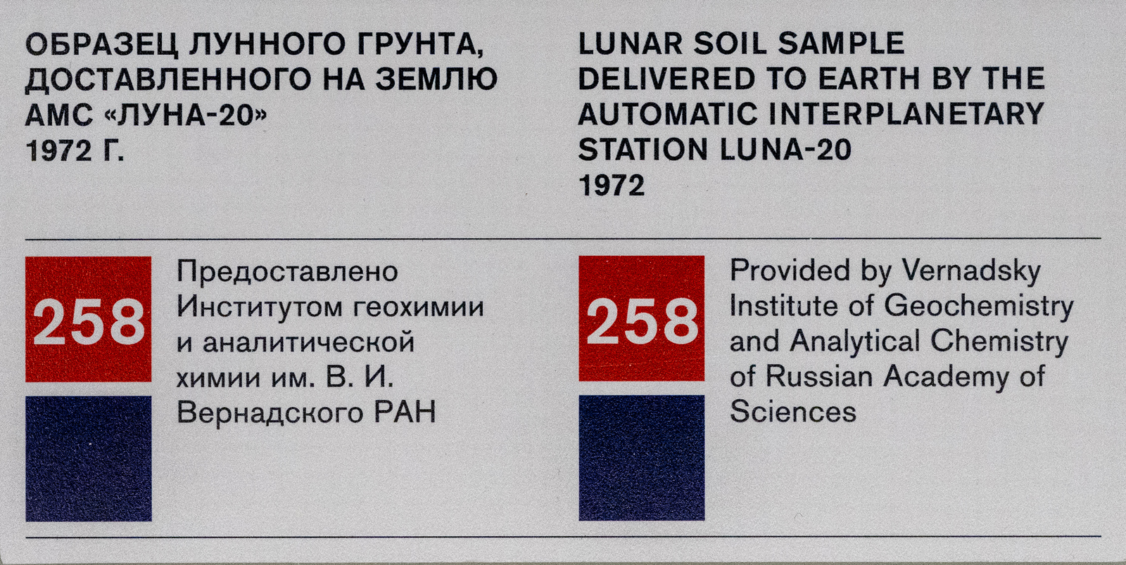 АМС «Луна-20» была запушена с космодрома Байконур 14 февраля 1972 года для взятия лунного грунта и доставки его на Землю. Грунт, доставленный станцией 25 февраля 1972, представлял собой 55 грамм рыхлого разнозернистого материала светло-серого цвета.