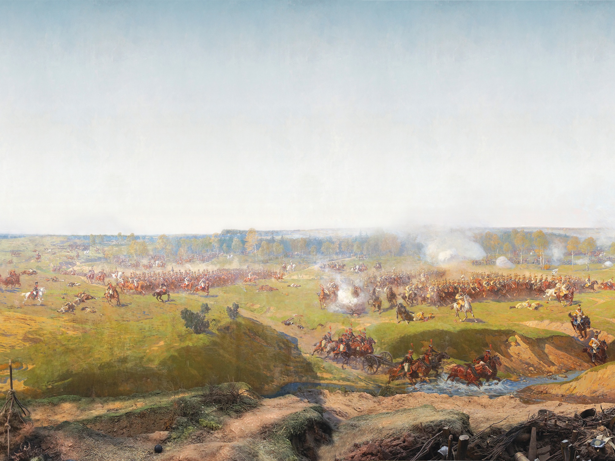 Наполеон на белом коне в сопровождении свиты направляется к Семеновскому оврагу. Перед сражением он заявил своим приближенным: «Идем вперед, откроем себе двери в Москву!». План французского императора состоял в том, чтобы мощным ударом главных сил разгромить и опрокинуть левый фланг русских войск. Сейчас Наполеон видит, что его войскам пока удалось, ценой больших потерь, захватить только один пункт неприятельской позиции, «флеши».