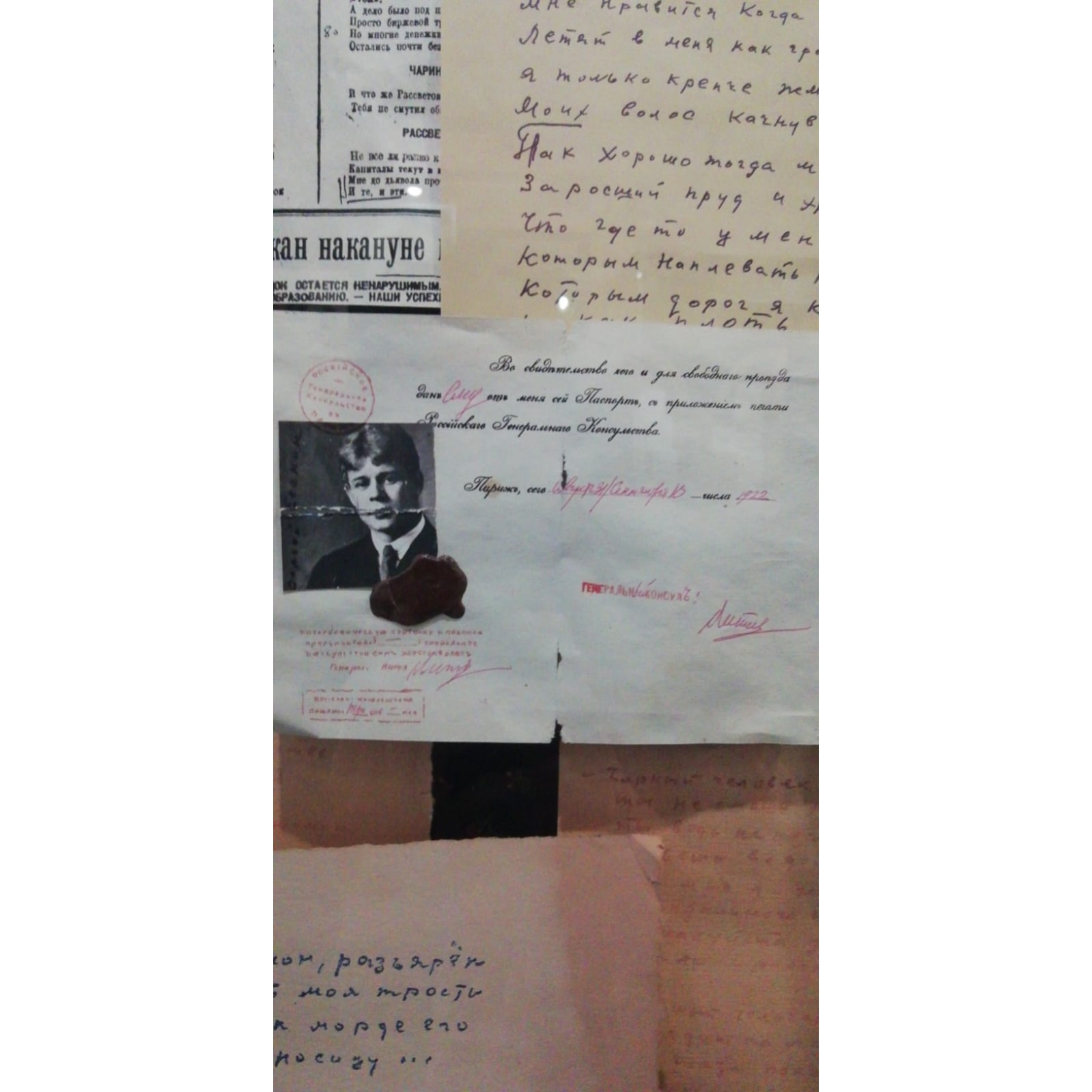 Век назад официальные документы выглядели гораздо проще, чем теперь. Паспорт был выдан поэту 13 сентября 1922 г. Российским генеральным консульством в Париже для проезда в США. Аналогичный документ был выдан на французском языке. Подпись поэта была поставлена на фотографии.