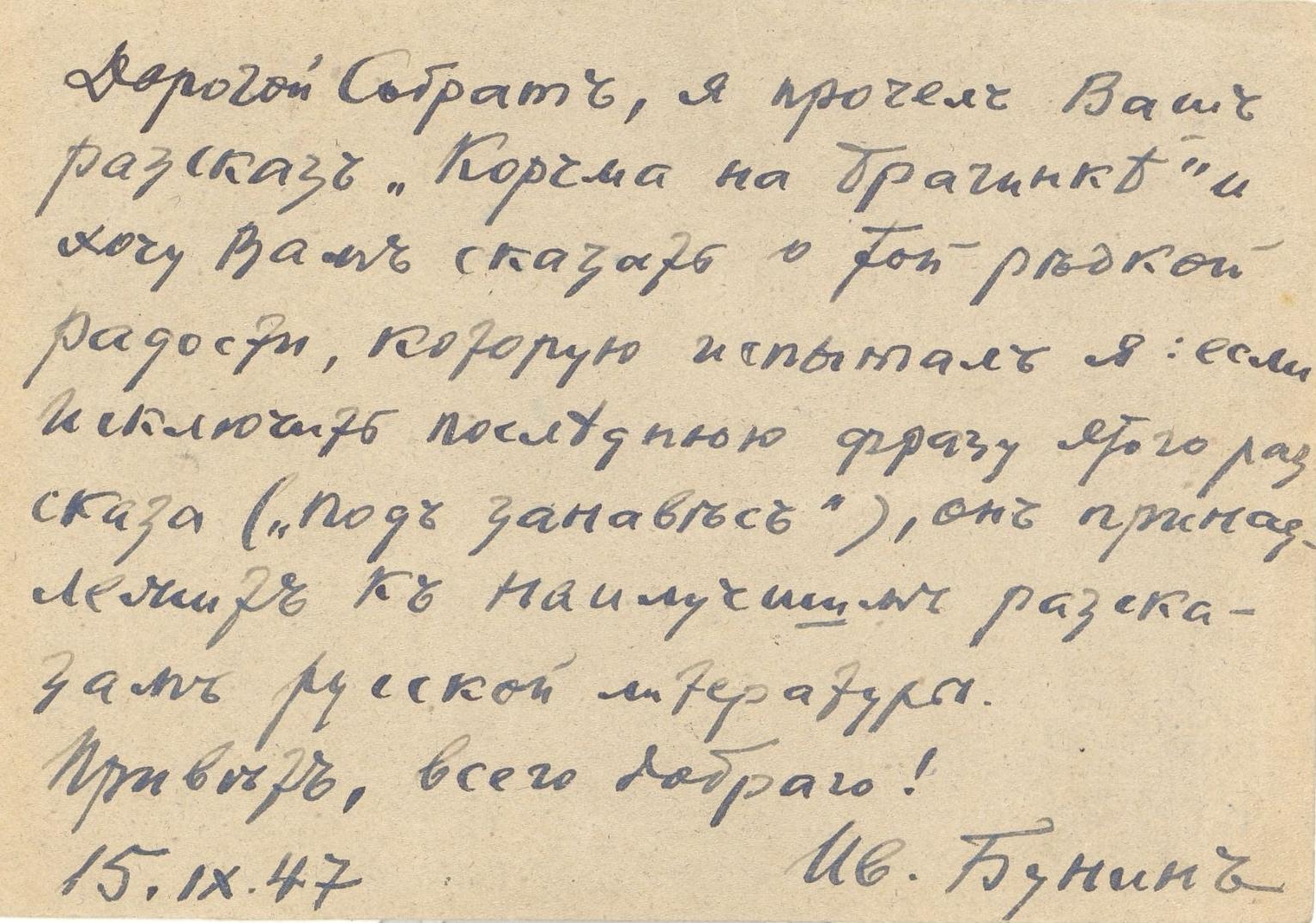 Короткое письмо Паустовскому с признанием его таланта можно считать исключительным событием в истории творческих и биографических взаимосвязей русского писателя-эмигранта и представителей советской литературы. Открытка Бунина свидетельствует о том, что он почувствовал в Паустовском духовно близкого писателя – «собрата», – увидел в нем наследника классической культуры, который в непростых исторических обстоятельствах продолжает русскую литературную традицию.