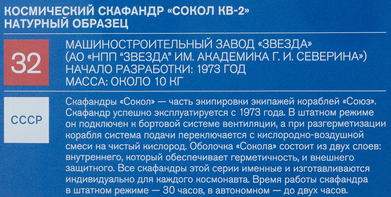 Скафандры «Сокол» - часть экипировки экипажей кораблей «Союз». Скафандр успешно эксплуатируется с 1973 года. Оболочка «Сокола» состоит из двух слоев: внутреннего, который обеспечивает герметичность, и внешнего защитного. Все скафандры этой серии изготавливаются индивидуально для каждого космонавта и обеспечивают 30 часов работы в штатном режиме, до двух часов – в автономном.