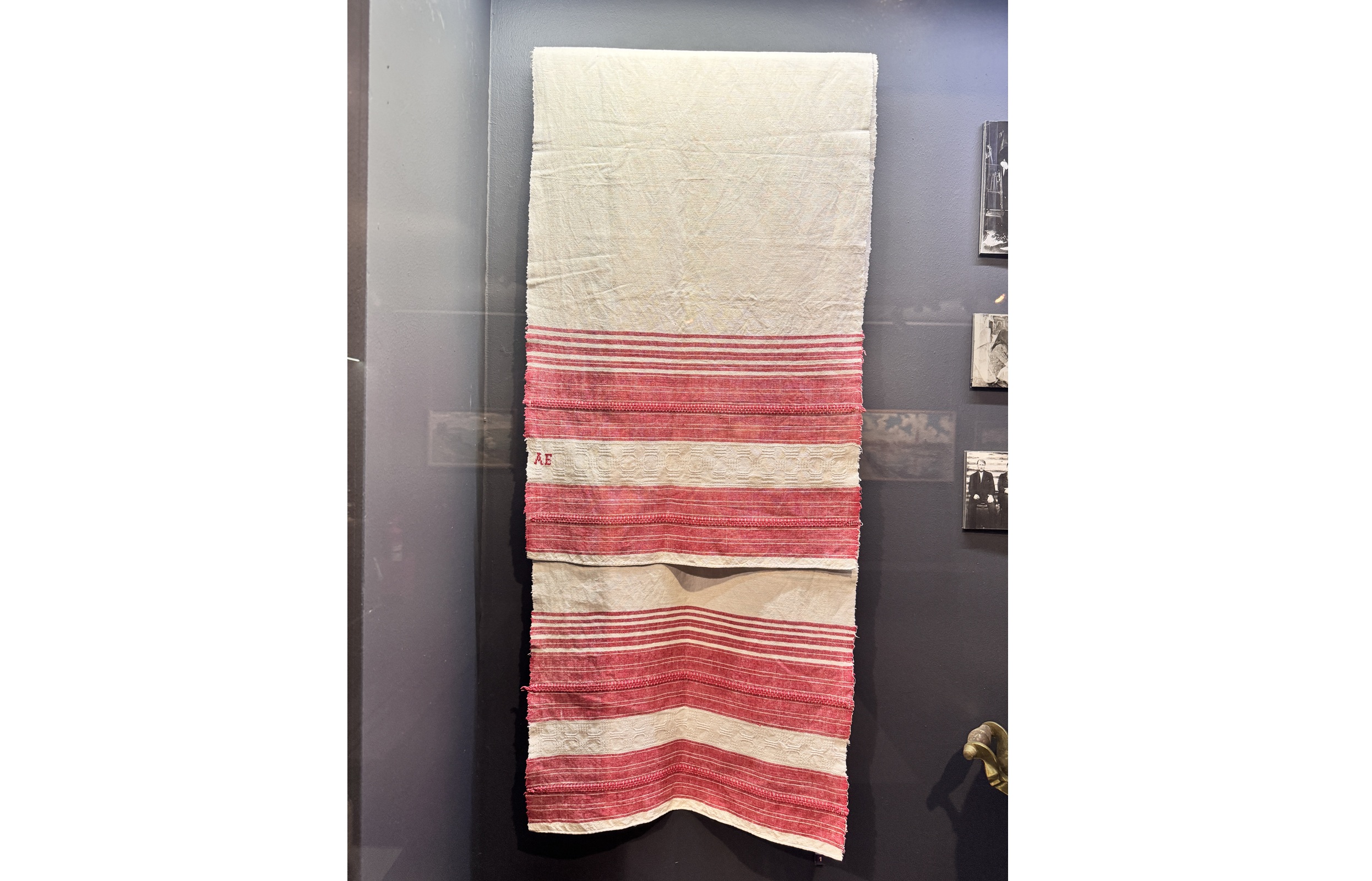 Красно-белое льняное домотканое полотенце, украшенное мережкой, принадлежало отцу поэта, поэтому на нем можно увидеть соответствующую монограмму – АЕ, то есть «Александр Есенин». Он долгие годы служил в Москве, зарабатывая деньги для семьи: был старшим приказчиком в мясной лавке замоскворецкого купца Крылова. Сына Александр Никитич мечтал «вывести в люди», планировал дать ему хорошее педагогическое образование в Московском учительском институте. Жил отец поэта в Большом Строченовском переулке, в общежитии, выстроенном купцом Крыловым для своих работников. Вещи, привезенные из дома, напоминали Александру Никитичу о родном Константинове. Как и ряд других мемориальных предметов, полотенце это передала в музей племянница поэта Светлана Петровна Есенина.