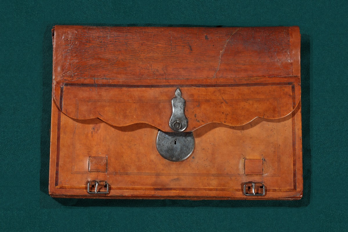 светло-коричневый кожаный портфель с тремя отделениями и одним замком. Это портфель Николая Васильевича Гоголя. Пушкин и Гоголь познакомились 20 мая 1831 года в Петербурге на вечере у общего знакомого – поэта и критика Петра Александровича Плетнева. Пушкин высоко оценил творчество Гоголя. «Сейчас прочел «Вечера близ Диканьки». Они изумили меня. Вот настоящая веселость, искренняя, непринужденная, без жеманства, без чопорности. А местами какая поэзия! Какая чувствительность! Все это так необыкновенно в нашей нынешней литературе, что я доселе не образумился...» Поэт подскажет Гоголю сюжеты комедии «Ревизор» и поэмы «Мертвые души». По воспоминаниям современника, в этом портфеле во время поездок Гоголь бережно хранил «…второй том «Мертвых душ» <…> Портфель не покидал Гоголя всю дорогу. На станциях он брал его в комнаты, а в тарантасе ставил всегда подле себя и опирался на него рукою. Немудрено, что он так заботился о нем. Здесь все было его достояние, все прошедшее и будущее, вся его слава!»