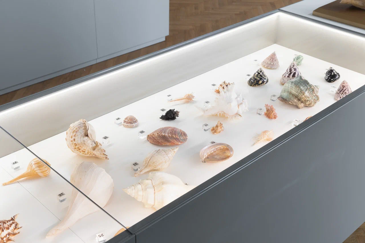 Теперь обратите своё внимание на большую горизонтальную витрину, на которой лежит тактильный экспонат — самое большое семя на земле. Это семя сейшельской пальмы.