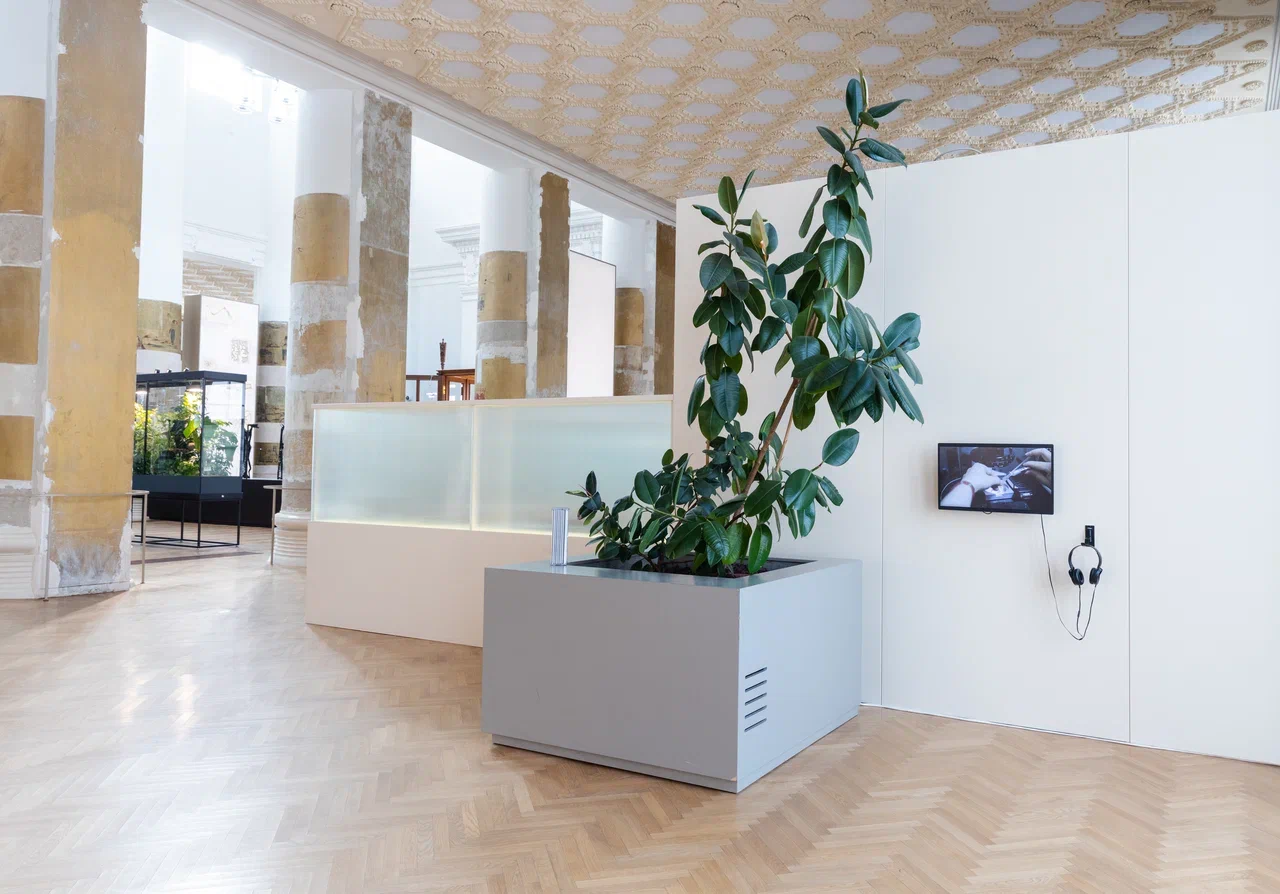 Раздражимость свойственна не только животным, но и растениям. Это свойство иллюстрирует сайенс-арт-инсталляция «Ропот», созданная арт-группой GreyCake. Художники представили модель для демонстрации реакции растения (в данном случае фикуса каучуконосного) на световой раздражитель. Компьютерная программа преобразовала электрические импульсы, генерируемые клетками растения, в звуки, интенсивность и высота которых зависят от силы импульсов, а следовательно, от силы света. Это показывает, что, хотя у растений нет нервных клеток, они тоже обладают раздражимостью. Кстати, листья фикуса повёрнуты к окну, то есть к свету, и это напоминает нам о том, что растения не совсем лишены подвижности. И это как раз тема следующего признака. Обернитесь.