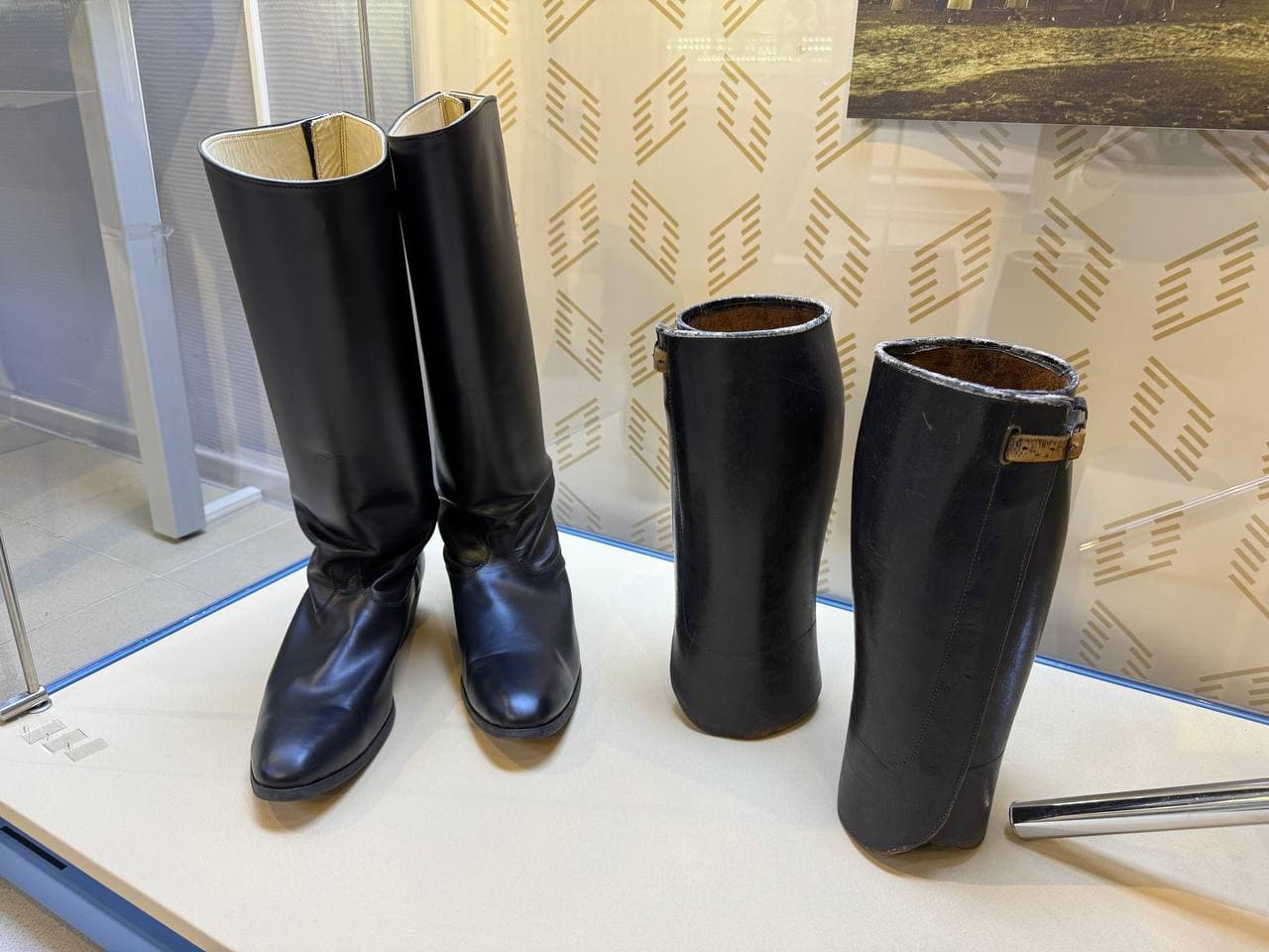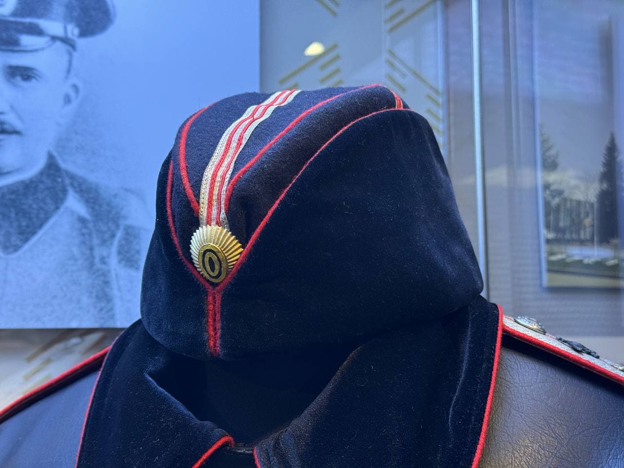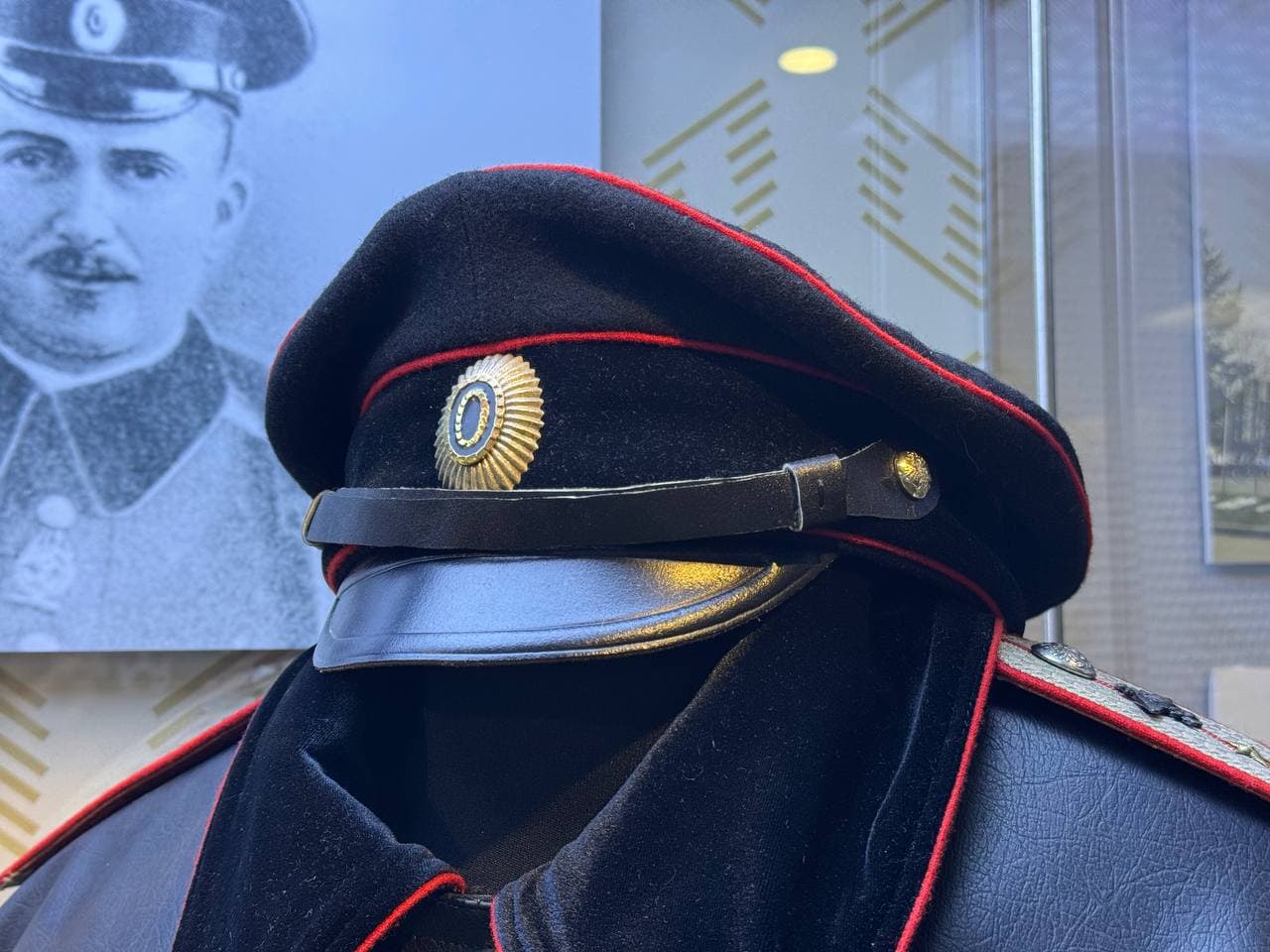 Так появилось специальное обмундирование для полетов и службы на аэродромах, представленное в витрине. В первую очередь это кожаная куртка черного цвета с черным бархатным отложным воротником и пуговицами, как на мундире. На ноги надевали шаровары такого же черного цвета. В нижней части витрины вы также можете увидеть кожаные сапоги, перчатки и краги для защиты ног, которые надевали вместе с ботинками. На голове носили либо парадную фуражку, либо пилотку из черного сукна с кокардой. Такое кожаное обмундирование в основном было предназначено для ношения в холодное время. Выдавалась экипировка не по числу летчиков, а по числу летательных аппаратов.