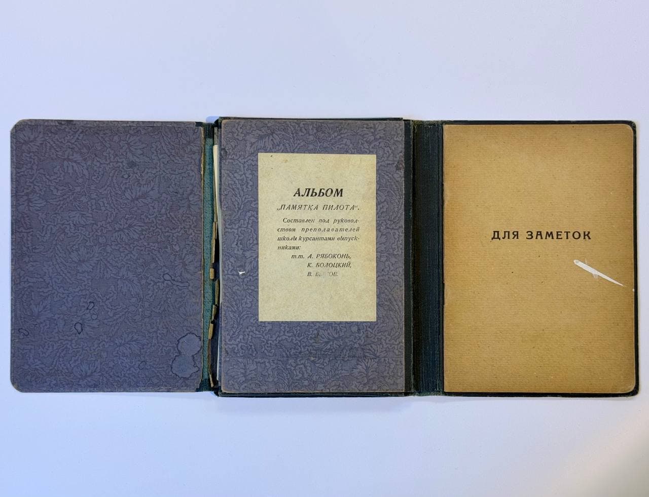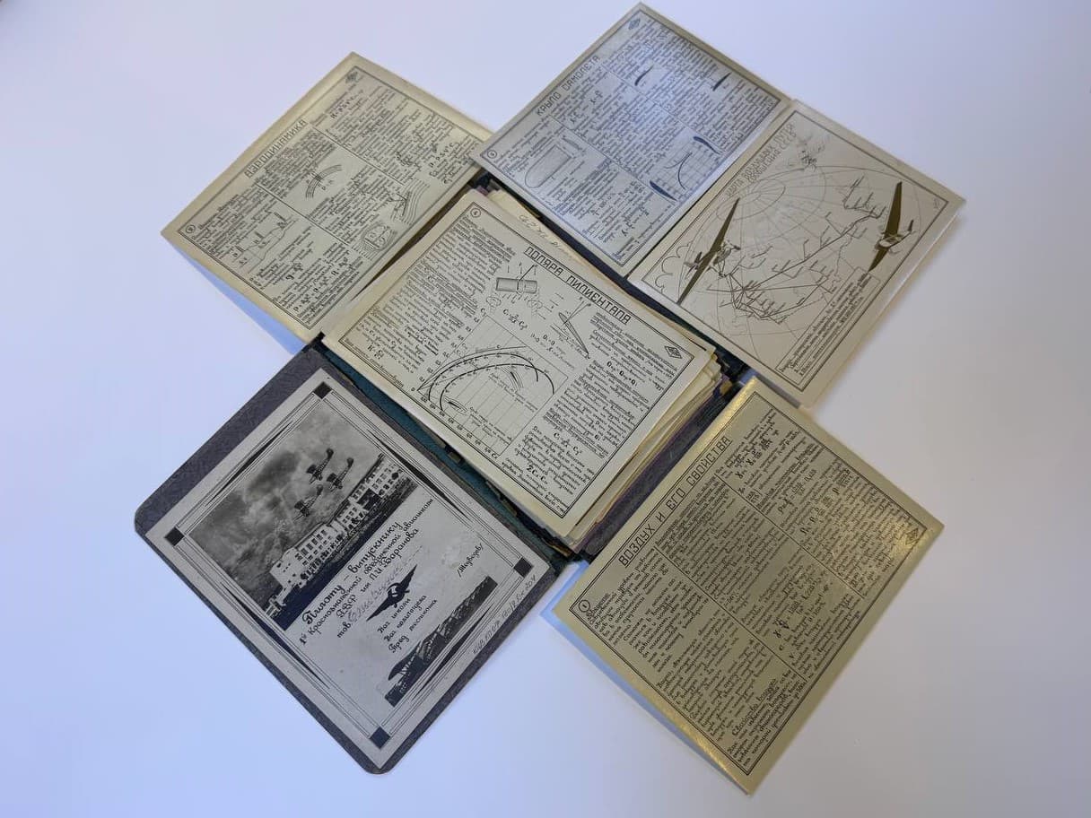 В витрине “Гражданская авиация в СССР: 1920—1930-е гг.” находится один из самых уникальных экспонатов нашего музея — альбом «Памятка пилота». В 30-е годы прошлого века в нашей стране начали открывать специальные учебные заведения для летчиков гражданской авиации — авиашколы. Изначально их было только три: в Ростовской, Тамбовской и Саратовской областях. Преподаватели одной из этих школ — Краснознаменной школы пилотов гражданского воздушного флота имени П.И. Баранова в г. Батайске, подготовили для выпускников этот альбом. Он представляет собой папку, которая содержит почти 40 листов схем, инструкций и задач. Так, например, на одном из листов представлена инструкция по использованию ветрочета, на другом можно увидеть информацию про аэродромные знаки. Такие альбомы были важными проводниками в мир авиации.
