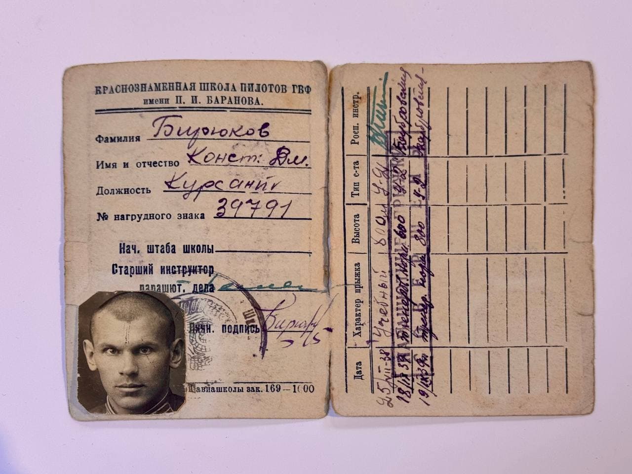 Обратите внимание на Книжку парашютиста пилота К.Д. Бирюкова.