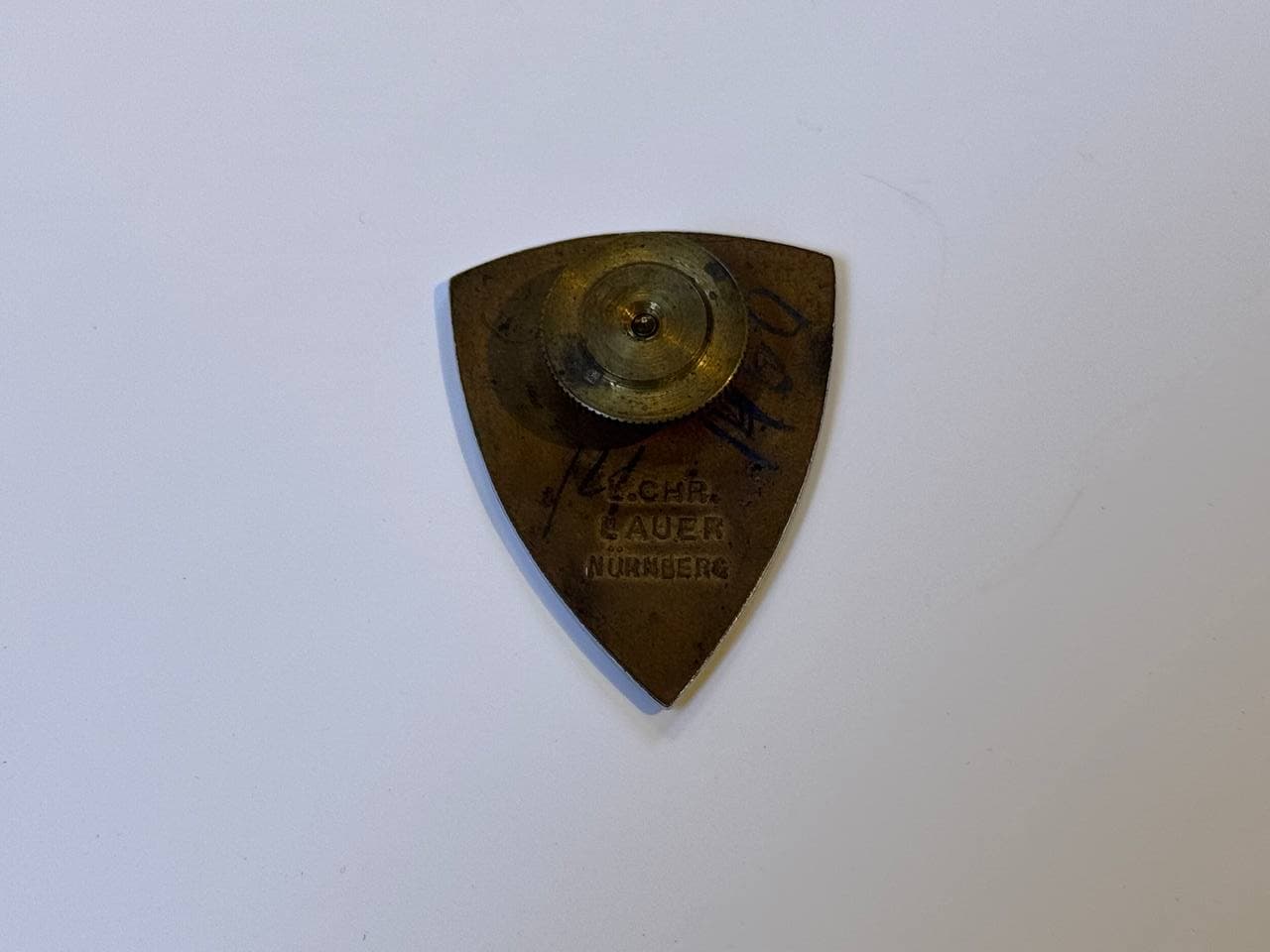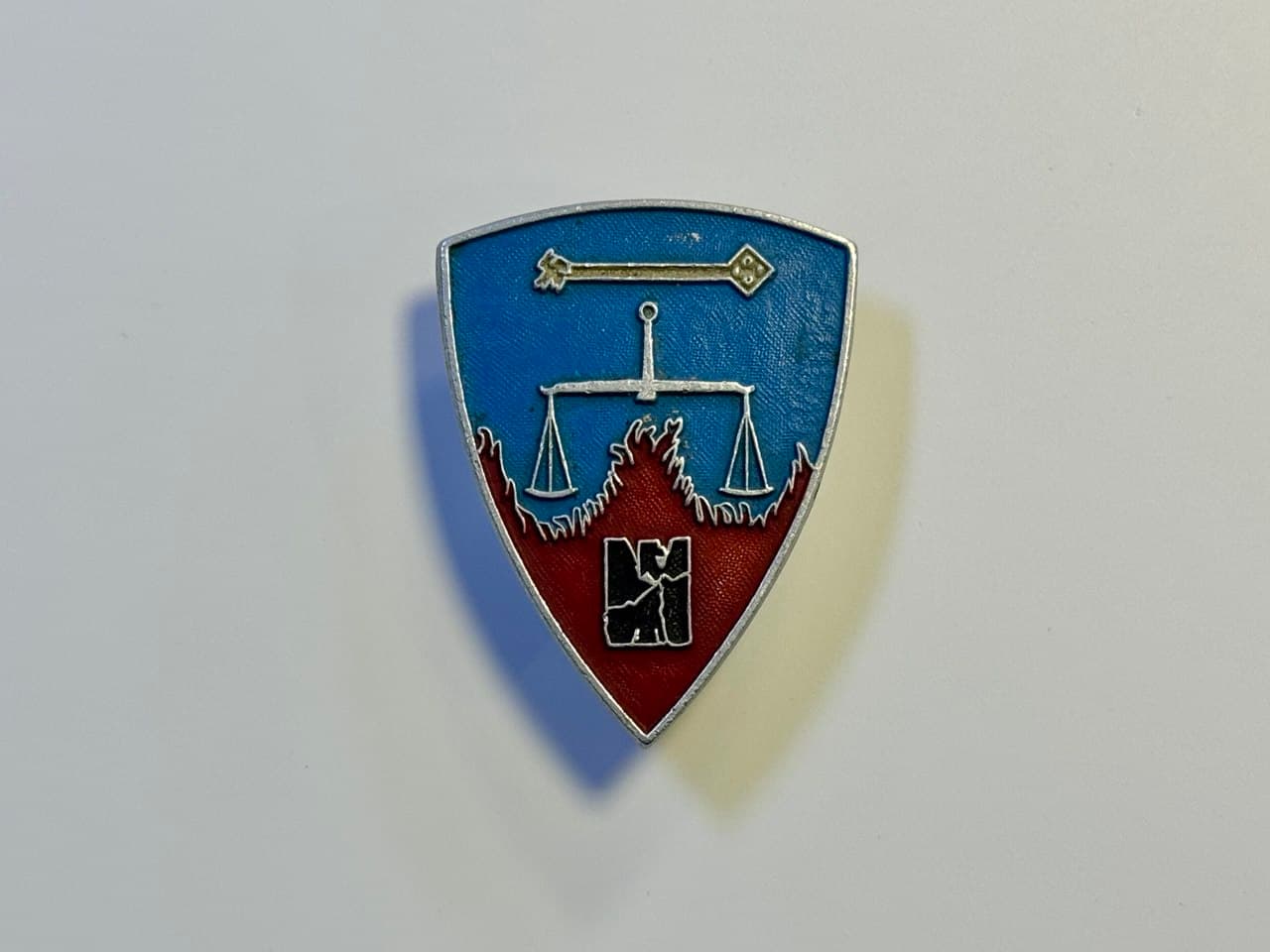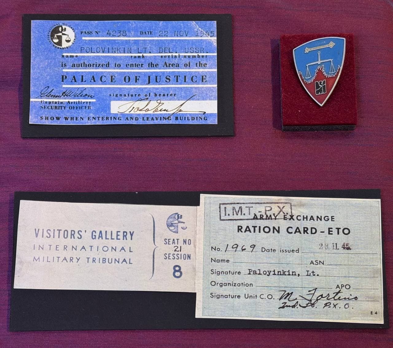 Перед вами представлены экспонаты, связанные с этим историческим событием: памятный значок участника Нюрнбергского процесса пилота Алексея Ивановича Стуканя, а также документы бортмеханика Степана Сергеевича Половинкина: пропуск в Палату Юстиции, где проходил процесс, билет на галерею посетителей на 8-ю сессию процесса, продуктовая карточка. Все они выполнены на английском языке.