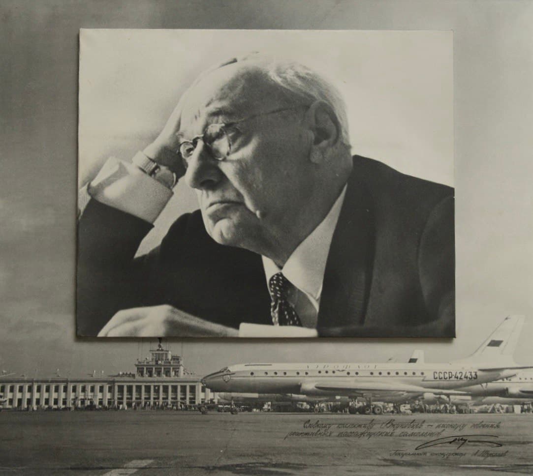 В центре витрины Вы можете увидеть портрет авиаконструктора Андрея Николаевича Туполева, который был подарен конструкторским бюро имени А.Н. Туполева коллективу Внуковского производственного объединения в связи с 35-летием начала пассажирских перелетов на реактивном самолете Ту-104. Сам Андрей Николаевич умер в 1972 г., и на портрете внизу справа стоит автограф его сына и последователя Алексея Андреевича Туполева. Туполев-старший был не только гениальным авиаконструктором, но и воспитал целую плеяду конструкторов, в том числе и своего сына, который возглавил предприятие после смерти отца. Именно Алексей Туполев руководил разработкой таких легендарных самолетов, как Ту-144 и Ту-154.