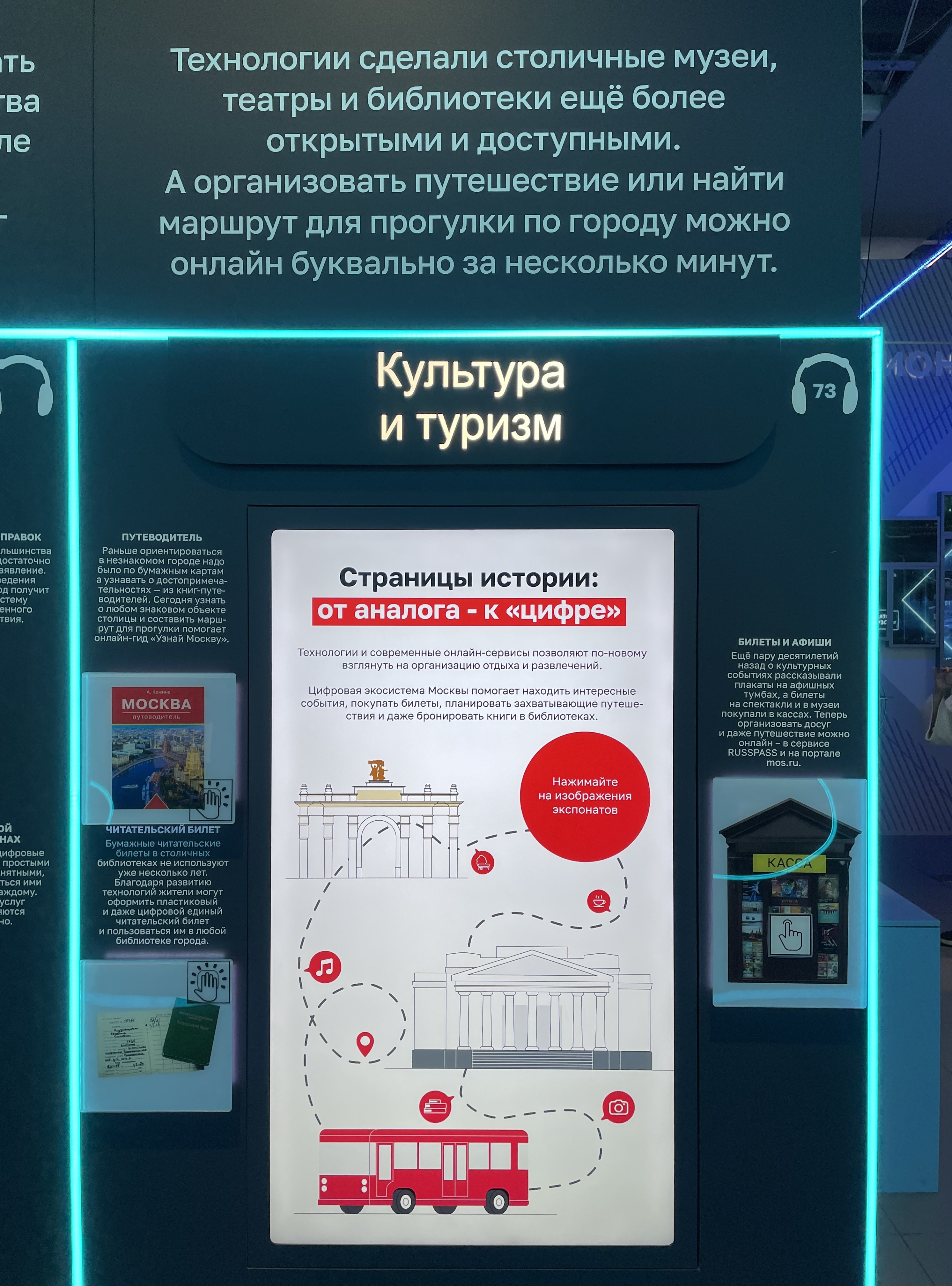 Нажимайте на экспонаты слева и справа от экрана и узнайте больше о сервисах Москвы в сфере культуры и туризма.
