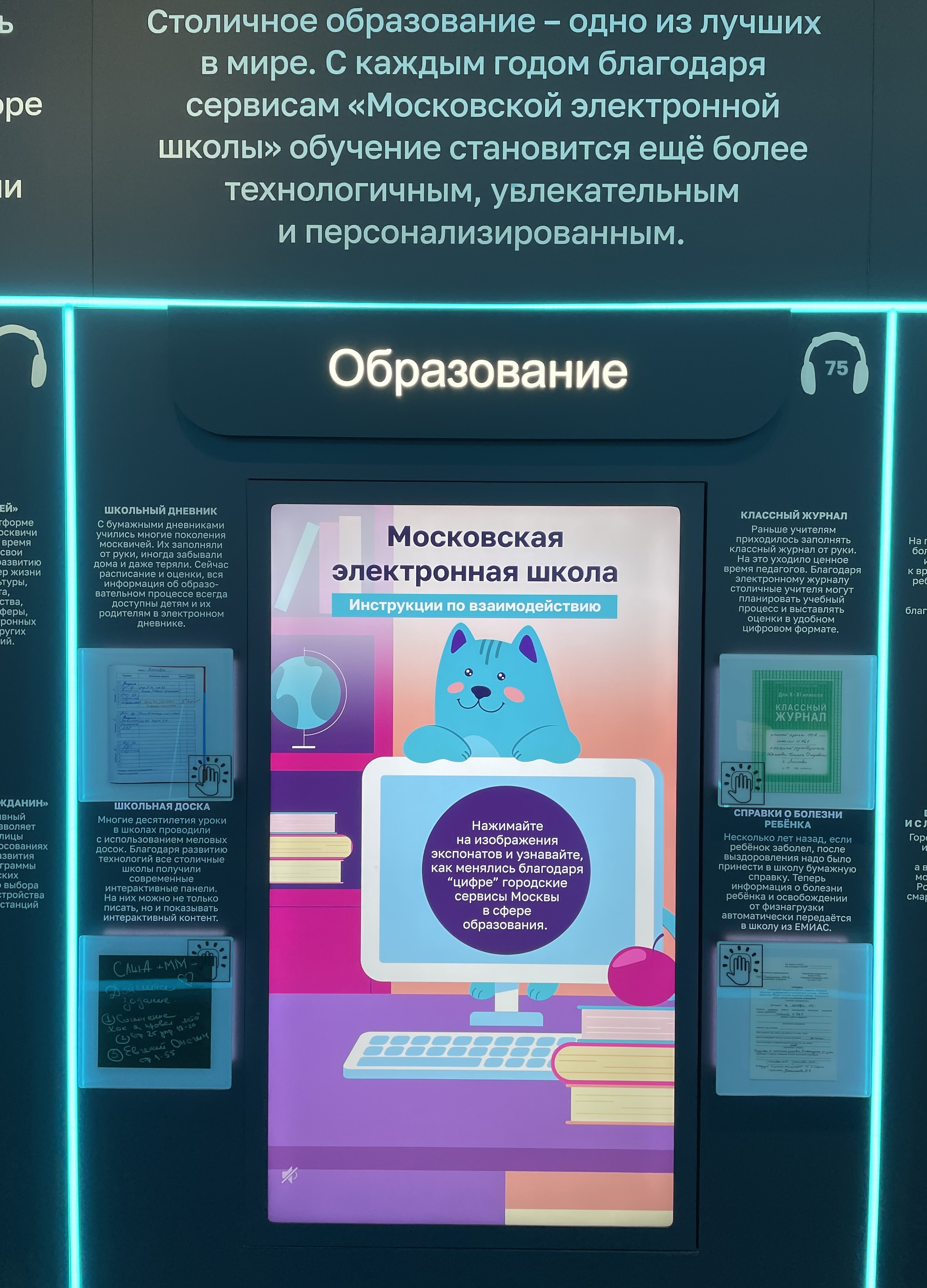 Нажимайте на экспонаты слева и справа от экрана: вы увидите познавательные ролики о возможностях «Московской электронной школы» и о том, как система образования столицы последовательно переходила от аналога к «цифре».