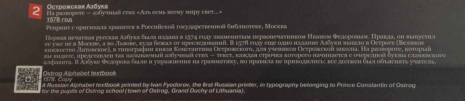 Первая печатная русская Азбука была издана в 1574 году знаменитым первопечатником Иваном Федоровым. Правда, он выпустил ее уже не в Москве, а во Львове, куда бежал от преследований. В 1578 году еще одно издание Азбуки вышло в Остроге (Великое княжество Литовское), в типографии князя Константина Острожского, для учеников Острожской школы. На развороте, который вы видите, представлен так называемый азбучный стих — текст, каждая строчка которого начинается с очередной буквы славянского алфавита. В Азбуке Федорова были и упражнения на грамматику, но правила не приводились: все должен был объяснять учитель.