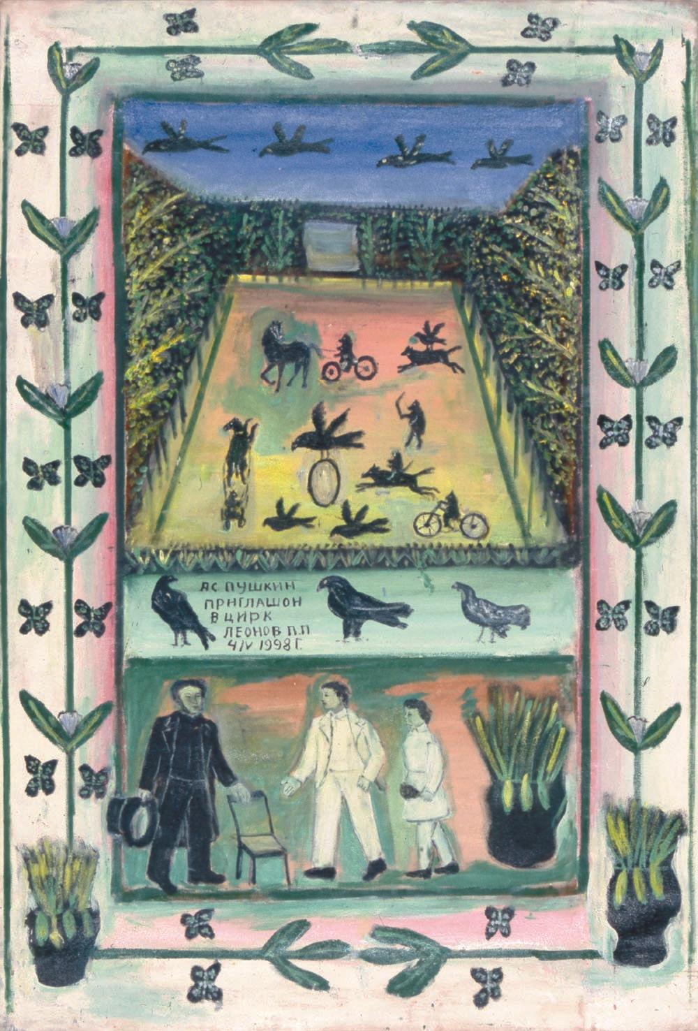 Леонов Павел Петрович. Леонов родился в 1920 г. в поселке Волотовском Орловской области. В конце 1930-х гг. уехал в город на заработки. Работал на заводах, рубил лес, ремонтировал суда, строил дороги, был столяром, штукатуром, печником, жестянщиком, маляром, художником-оформителем. Жил в Орле, в Украине, в Азербайджане, Грузии, Узбекистане. В 1940 - 1950-е годы несколько раз арестовывался. С 1975 г. проживает в Ивановской области. С детства мечтал стать художником, но поступил в Заочный народный университет искусства в Москве лишь в 1960 году. Учителем Павла Леонова был Михаил Рогинский, который прозвал художника "Дон Кихот советской эпохи". Первая московская выставка художника проходит в 1970 году. Тогда, в период "второго авангарда", к Леонову приходит известность. В 1980-е он бросил заниматься живописью, опасаясь фининспекторов, и продолжил лишь после 1991 года - тогда начался его самый плодотворный период. Умер Павел Петрович Леонов 25 марта 2011 года в поселке Савино Ивановской области. Отечественные и зарубежные специалисты считают Павла Леонова одним из наиболее ярких представителей российского наивного искусства. Его имя включено во Всемирную энциклопедию наивного искусства (Белград, 1984). Участник всесоюзных и всероссийских выставок 1970 - 1980-х годов, концептуальных экспозиций 1990-х. В 1997 году на Международной выставке наивного искусства "INSITA" в Братиславе (Словакия) удостоен Гран при. На следующем фестивале "INSITA-2000" была представлена его персональная выставка. В том же году на 6-м Интернациональном конкурсе наивного искусства "Gallerie pro art Kasper" в Швейцарии удостоен Гран при. Участник передвижных выставок Музея наивного искусства:"Пушкинские образы в творчестве наивных художников России" (1999), "И увидел я новое небо" (2001). Участник Московских международных фестивалей наивного искусства и творчества аутсайдеров "Фестнаив-2004", "Фестнаив-2007" и "Фестнаив-2010". Работы находятся во Владимиро-Суздальском музее-заповеднике, Государственном российском доме народного творчества, Государственном музее-заповеднике «Царицыно», Музее наивного искусства в Москве, частных собраниях в России и за рубежом.