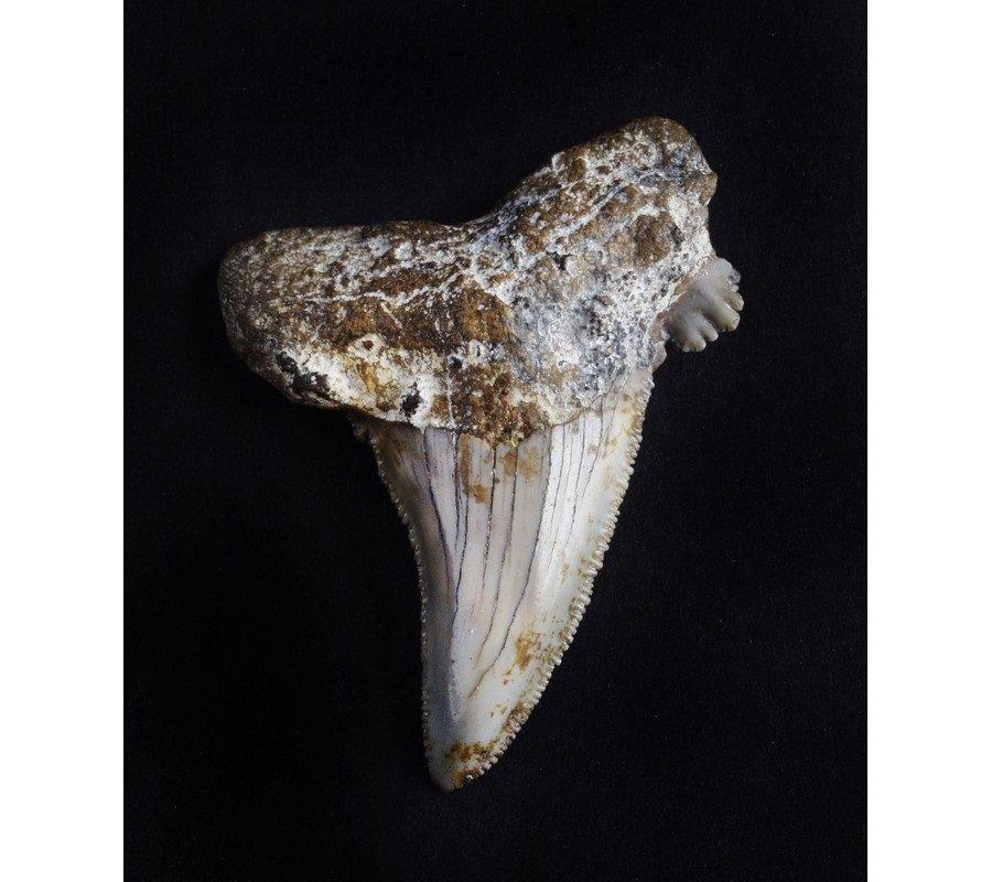 Верхнечелюстной зуб ископаемой ламноидной акулы Кархароклес посейдона (Carcharokles posidoni Zhelezko, 1994) из миоценовых отложений Украины.