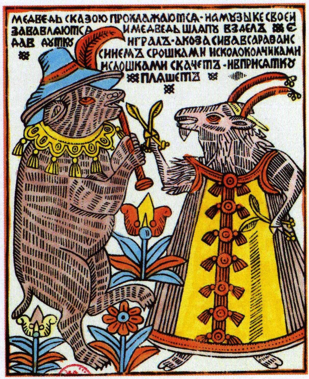 «Медведь с козою прохлаждаются, на музыке своей забавляются. И медведь шляпу вздел да в дудку заиграл, а коза сива в сарафане синем с рожками и колокольчиками и с ложками скачет и вприсядку пляшет». Картинка, гравированная на дереве около 1766 г. 290х355 мм. Из бывшей коллекции Олсуфьева. Скоморох с медведицей и артист, наряженный козой, — персонажи старинного народного зрелища. О кукольной комедии с участием этих же действующих лиц мы узнаем из рисунка путешественника XVII века Адама Олеария.