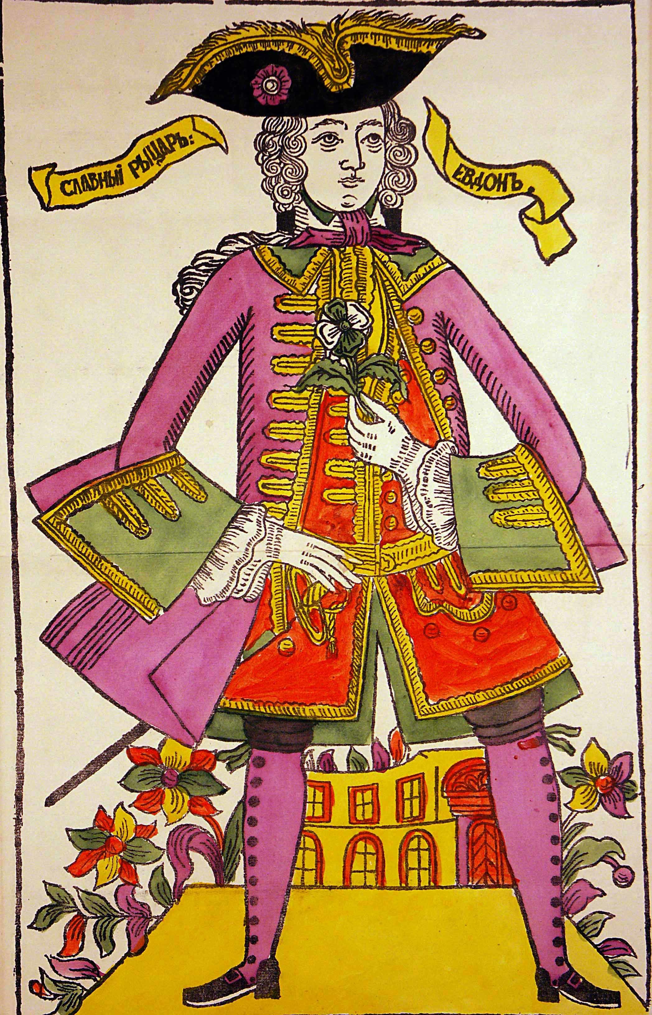 Этот персонаж, так же, как и Берфа Прекрасная, заимствован из немецкого романа «Курьезная история», переведенного на русский язык в XVII или XVIII веке. На этой гравюре, однако, Евдон одет во французское платье. Картинка на двух листах. 340х555 мм. В России он начал циркулировать в XVIII в., сперва в рукописных списках, затем в печатных вариантах. Подобные работы привлекают большое внимание благодаря своим сюжетам, обычно основанным на любви двух идеальных характеров. Во имя своей любви герой пускаете в странствия, подвергает себя смертельному риску, совершает подвиги. Двум любящим помогают или препятствуют магические силы и чудовища. Символизирующая преданность и любовь, Берфа является идеалом красоты и женской добродетели. В новеллах вроде Истории Евдона и Берфы женщине отводится пассивная роль. Она не предпринимает действий, а лишь является объектом любви, почитания и преданности, или же жертвой коварства, преследований и насилия.