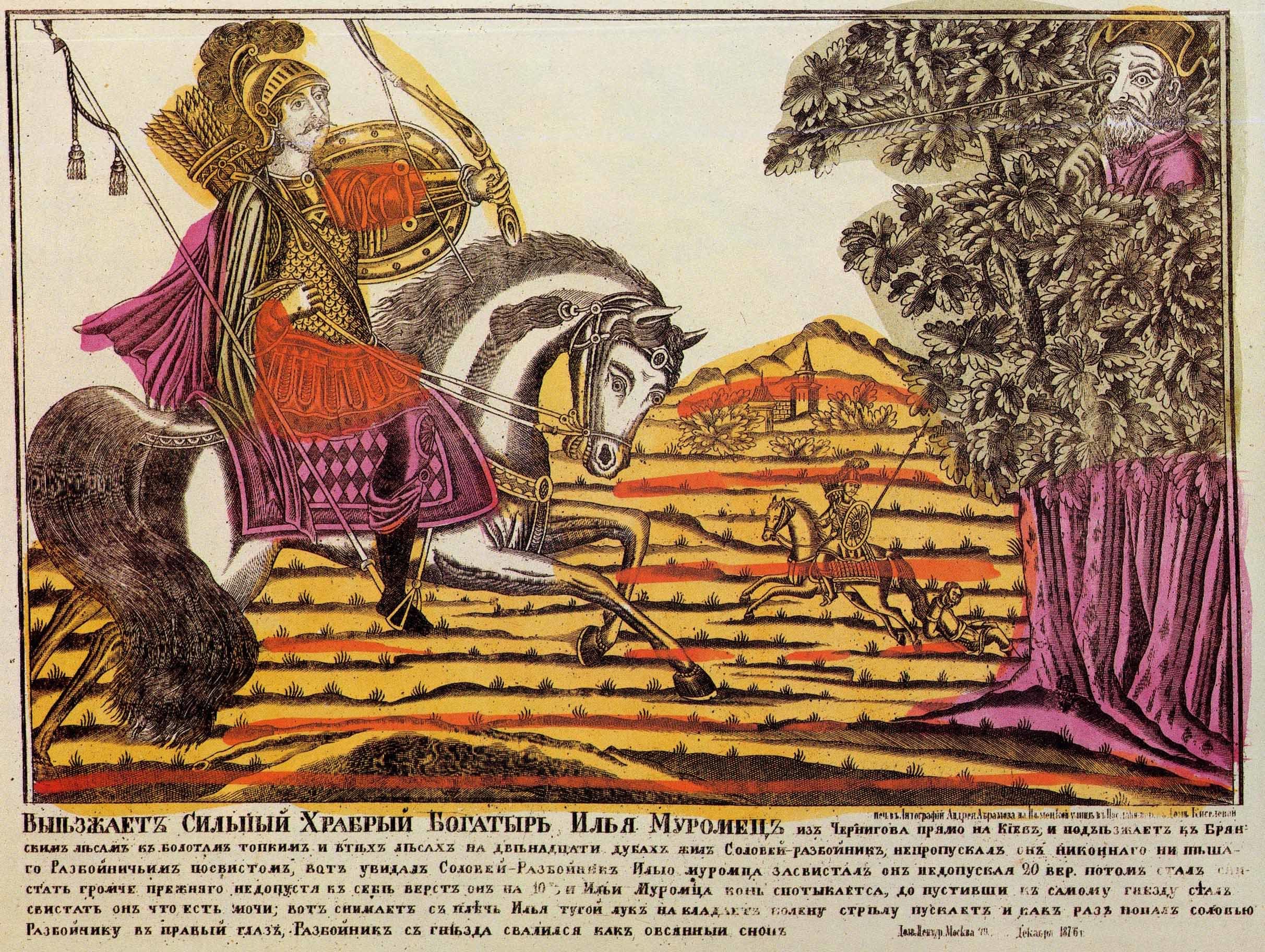 «Бой сильных богатырей Ильи Муромца с Соловьем-разбойником: в поле съезжаются, храбростью своею похваляются». Гравюра на дереве. Москва (?). XVIII в. 255х330 мм. Из бывшей коллекции Олсуфьева. Оба героя одеты во французское платье.