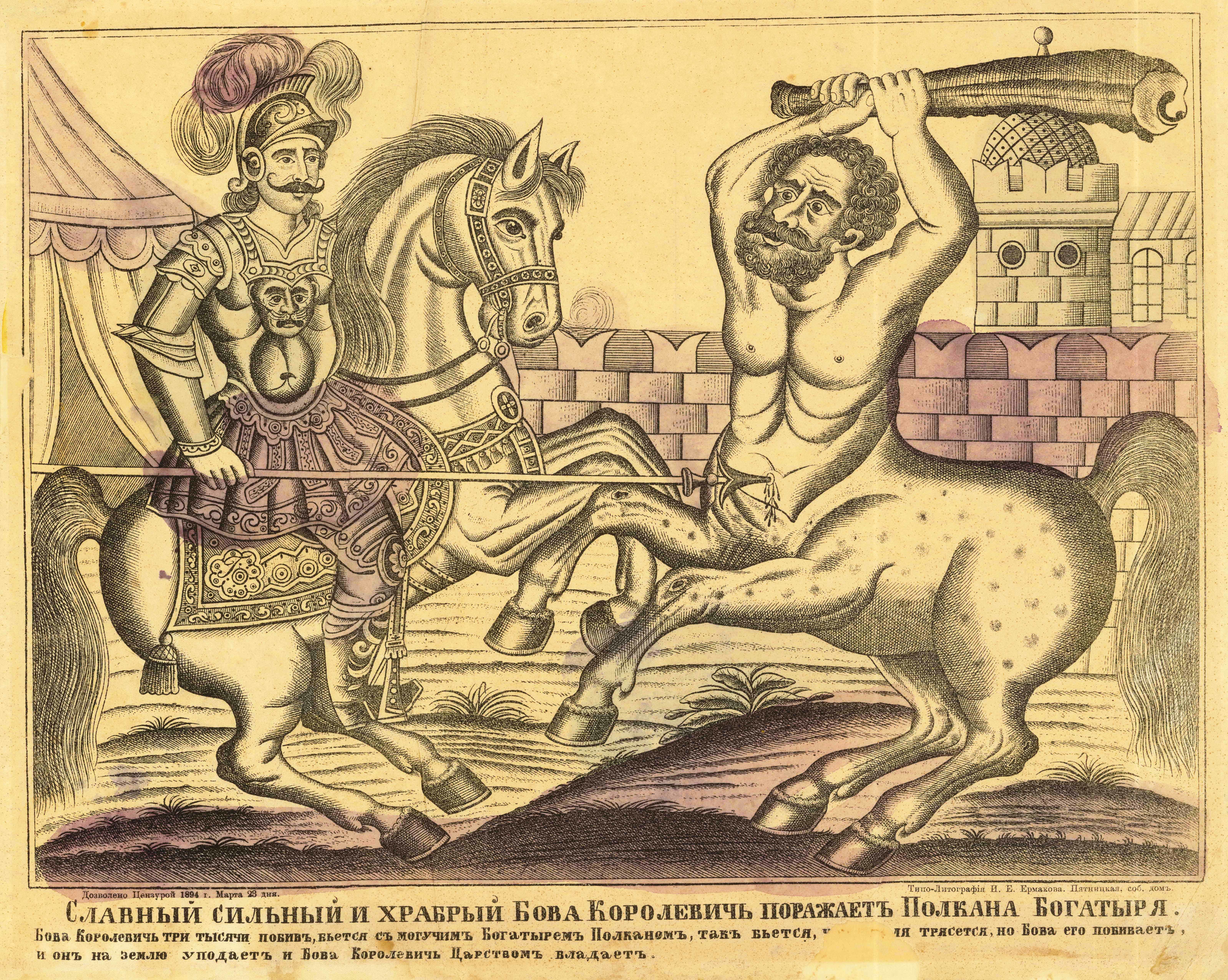 Сюжет встречается в русском лубке с начала XIX века. Известна также лубочная книжка из 8 картинок и полная из 32, текст которой восходит к печатному изданию истории о Бове XVIII века. До той поры европейский рыцарский романа бытовал в России только в рукописях (с XVIII в.).