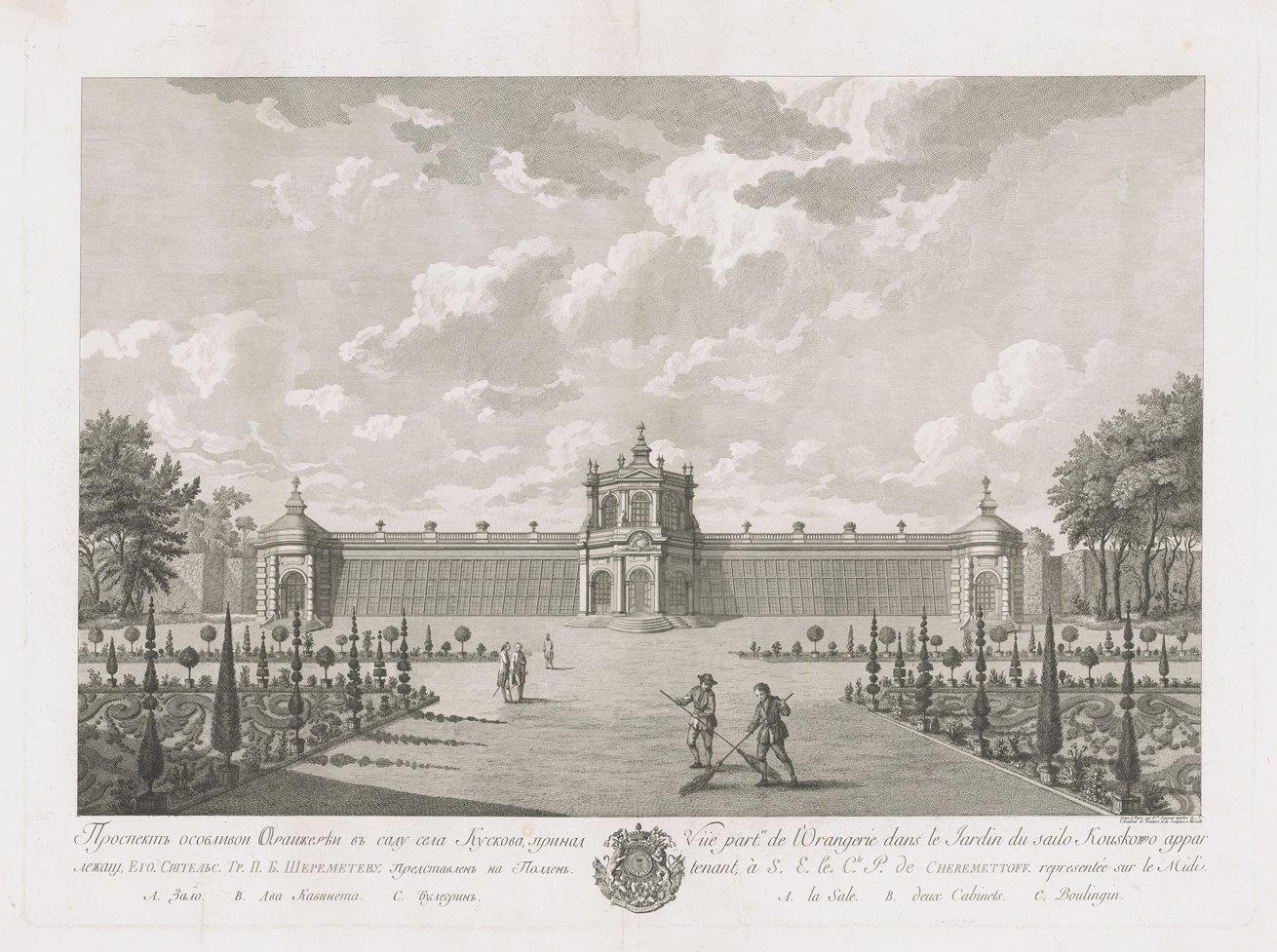 "Проспект особливой Оранжереи в саду села Кускова, принадлежащ Его Сiятельс. Гр. П.Б.Шереметеву. Представлен на Полдень".