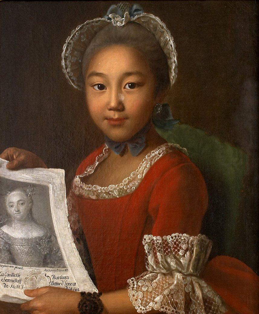 Любимая воспитанница графини Варвары Алексеевны Шереметевой. Это один из самых проникновенный и искренних портретов художника. Он является лучшим из немногих детских портретов в творчестве Ивана Аргунова. Воспитание в дворянской среде маленьких калмычат с середины XVIII в. становится своеобразной "модой", обусловленной политикой Екатерины II по присоединению Калмыкии к России. Положение и обязанности калмыков в дворянском доме определялись благодетелями - их брали в услужение или определяли компаньонами, чаще всего к хозяйке дома. Калмычка держит в руках гравированный портрет хозяйки, демонстрируя его зрителю. Граф заказал этот портрет, видимо, желая увековечить память жены и прославить ее воспитательную и благотворительную деятельность.