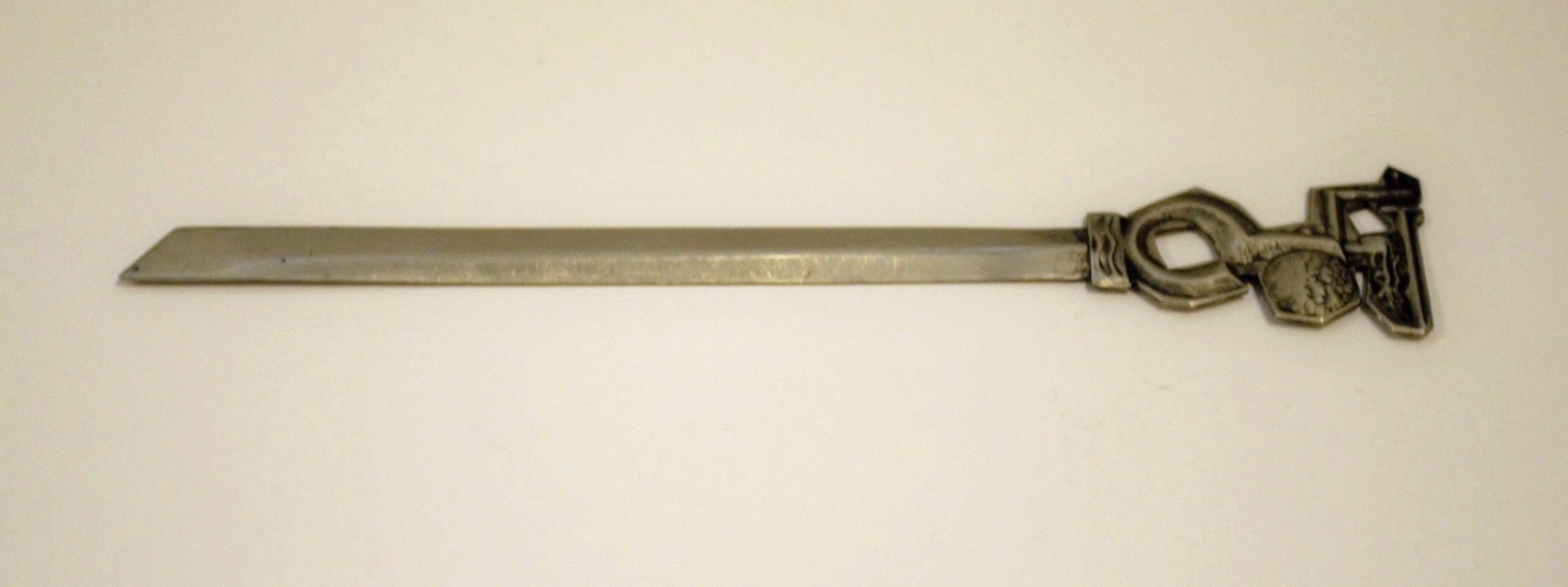 Нож для разрезания бумаги с гербом Варшавы. Привезен А.А. Тахо-Годи из Польши. Всегда находился на рабочем столе Лосева. Использовался для разрезания страниц дореволюционных изданий.